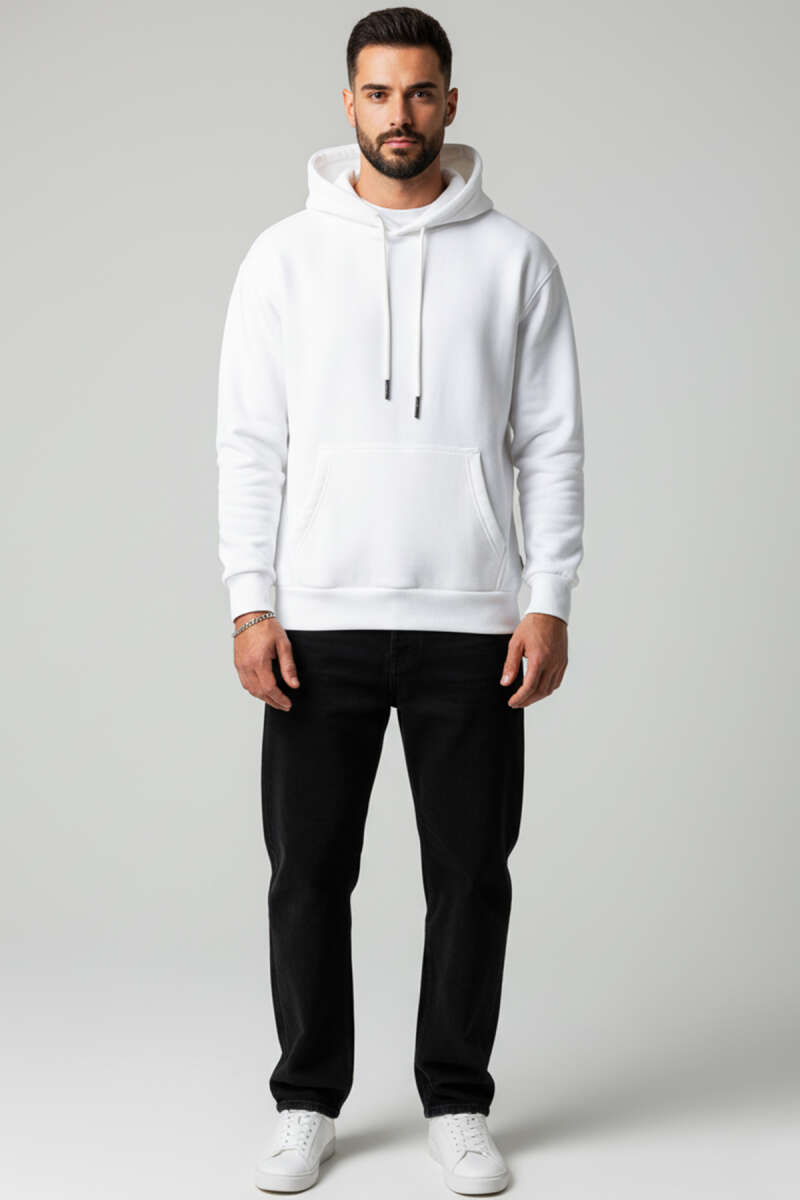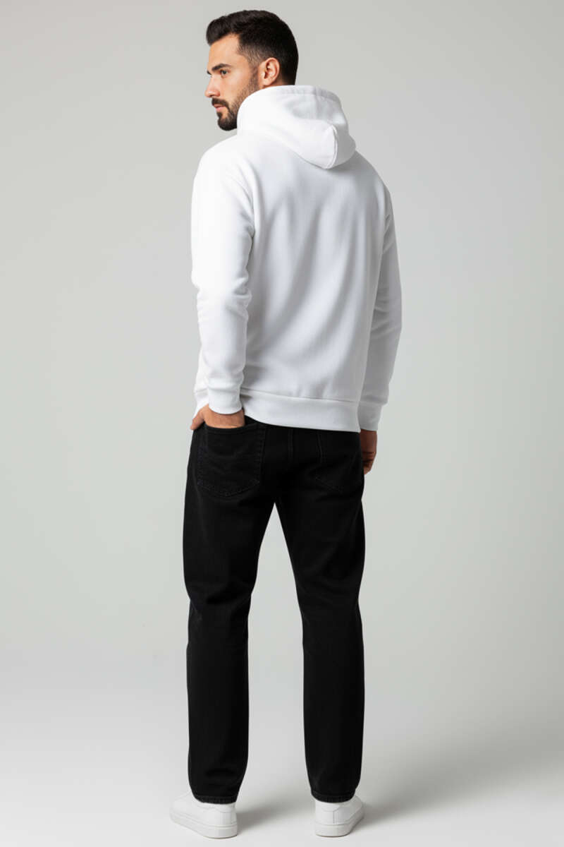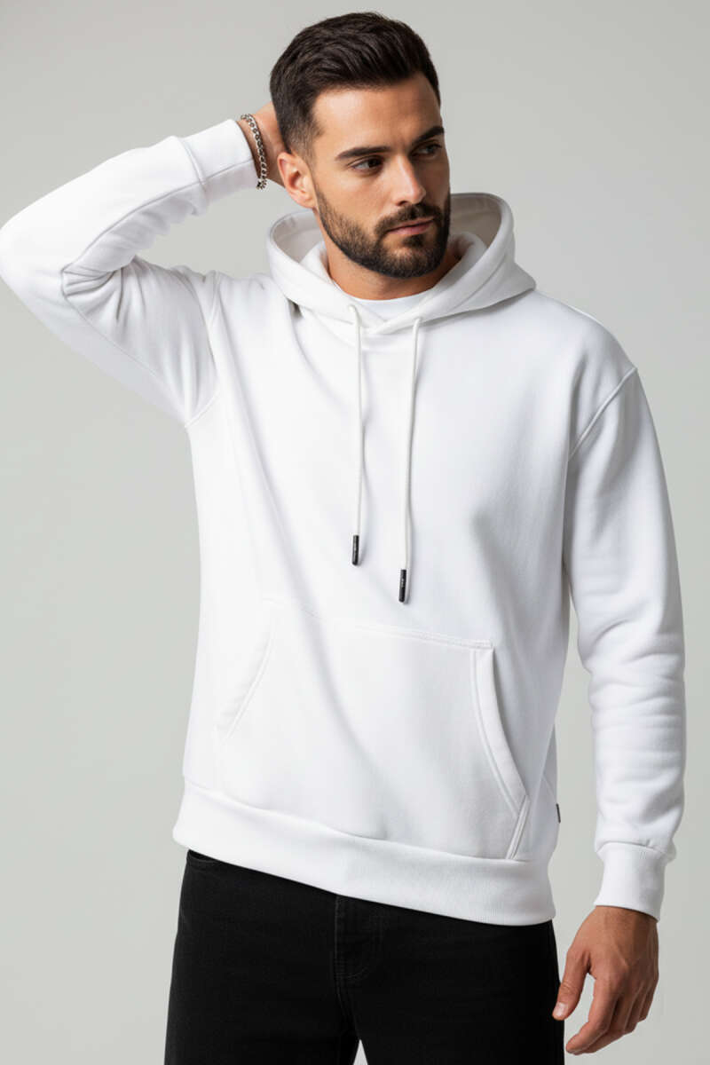 Üç İplikli Kapüşonlu Erkek Sweatshirt Beyaz