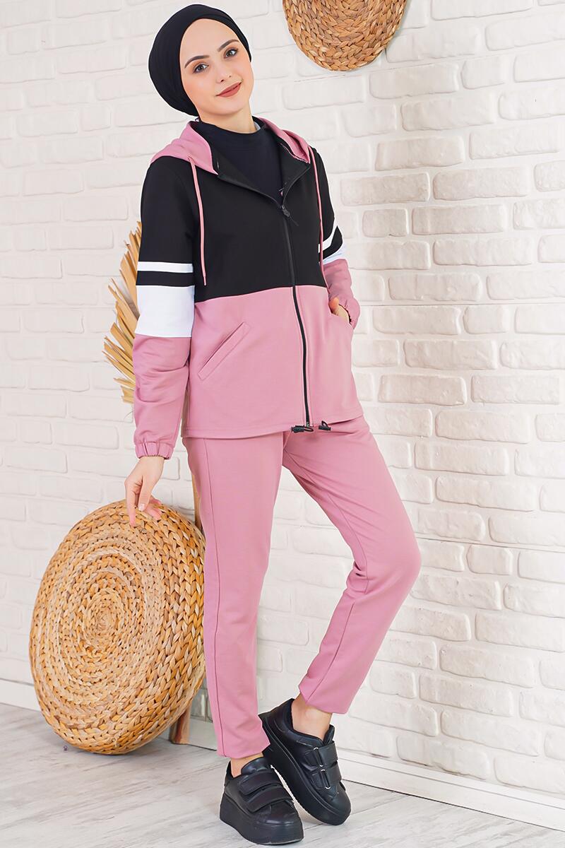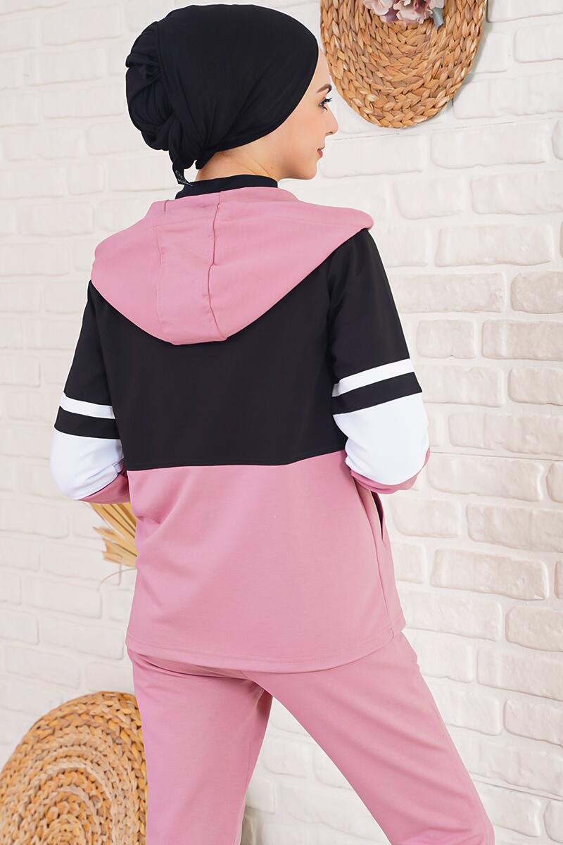 Üç Renk Kapüşonlu Siyah Gül Kurusu Eşofman Takımı