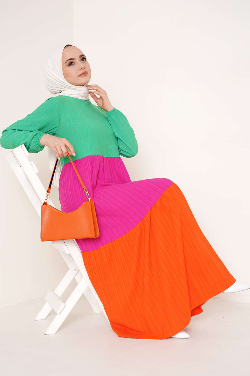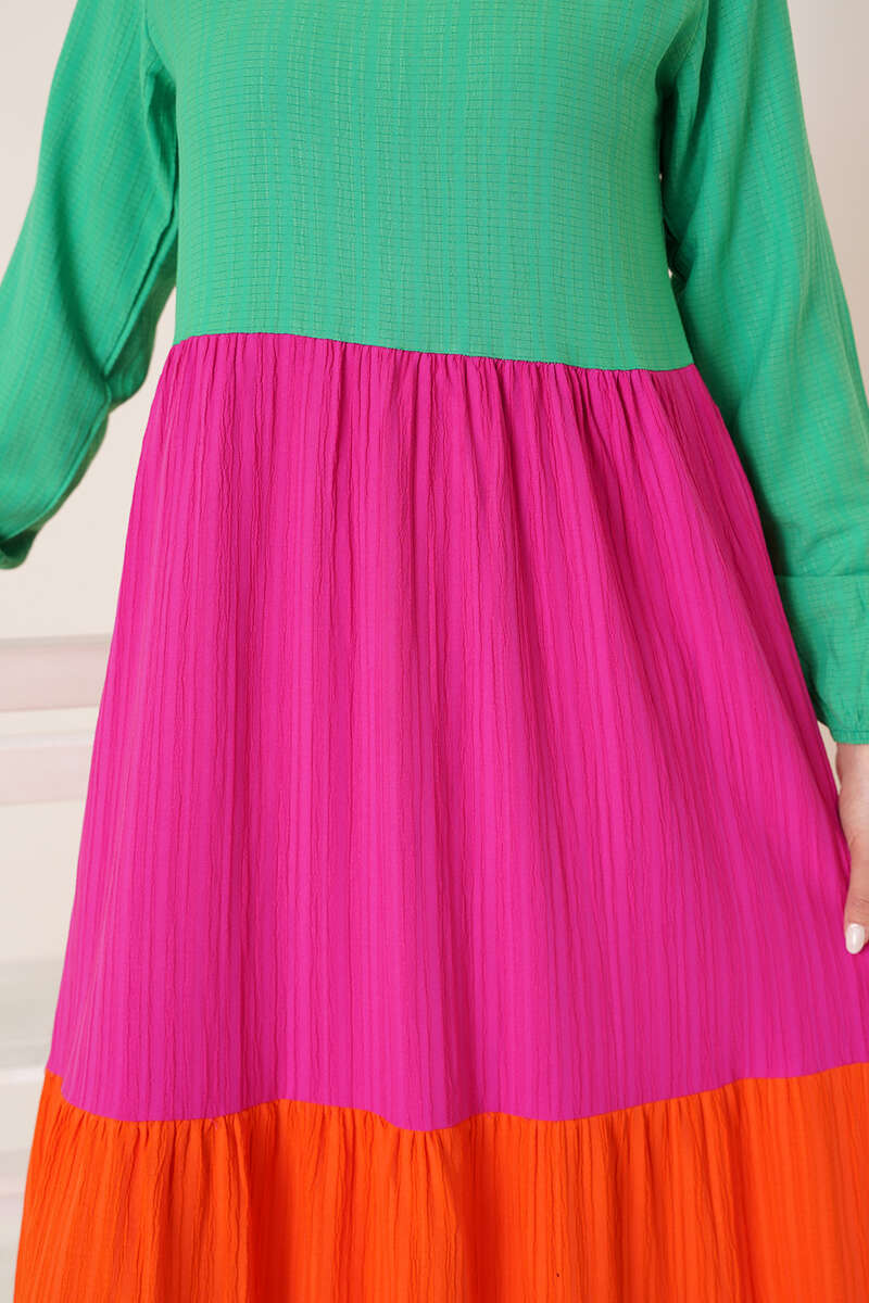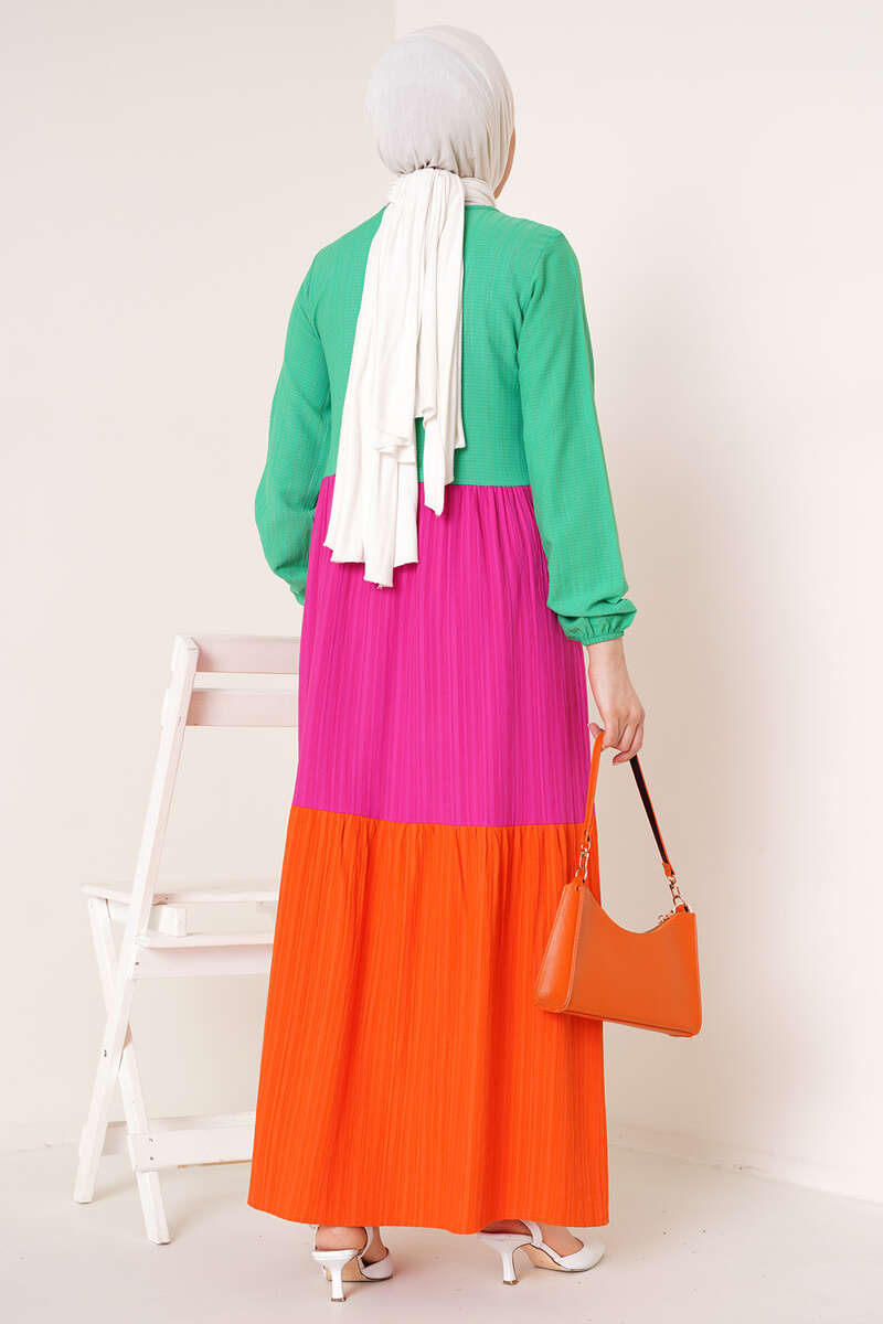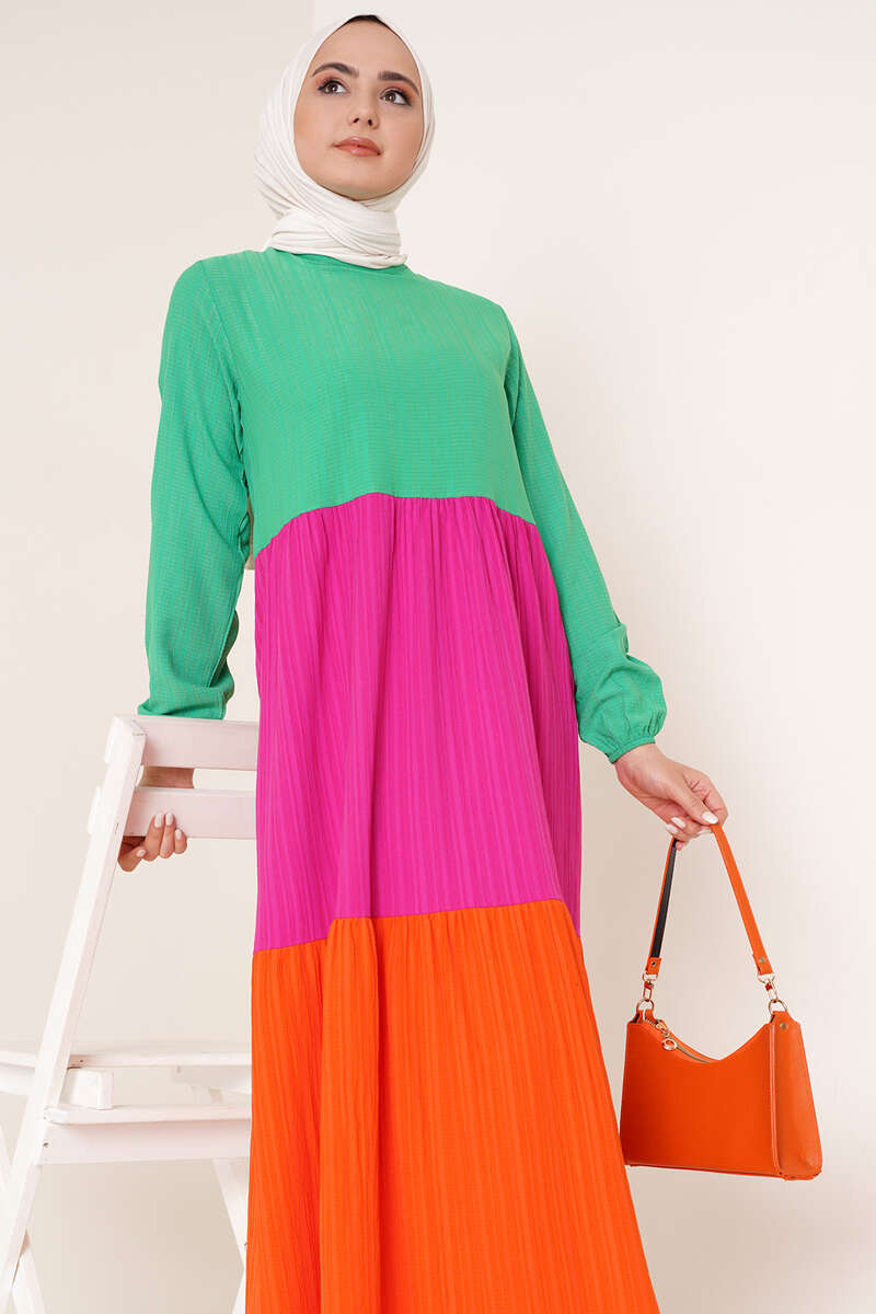 Üç Renkli Kat Kat Elbise Yeşil