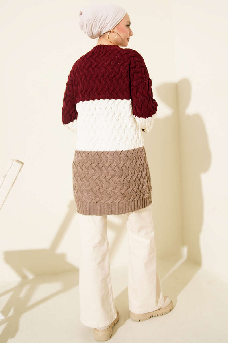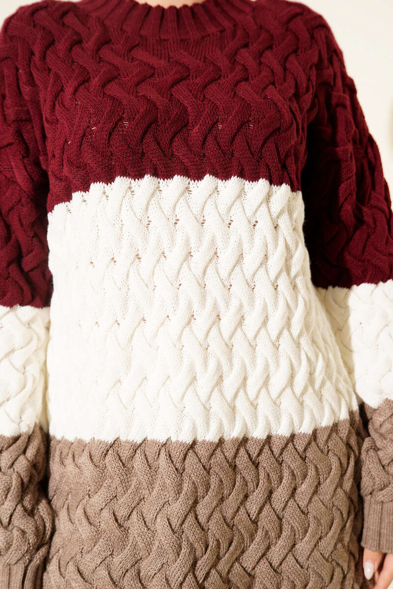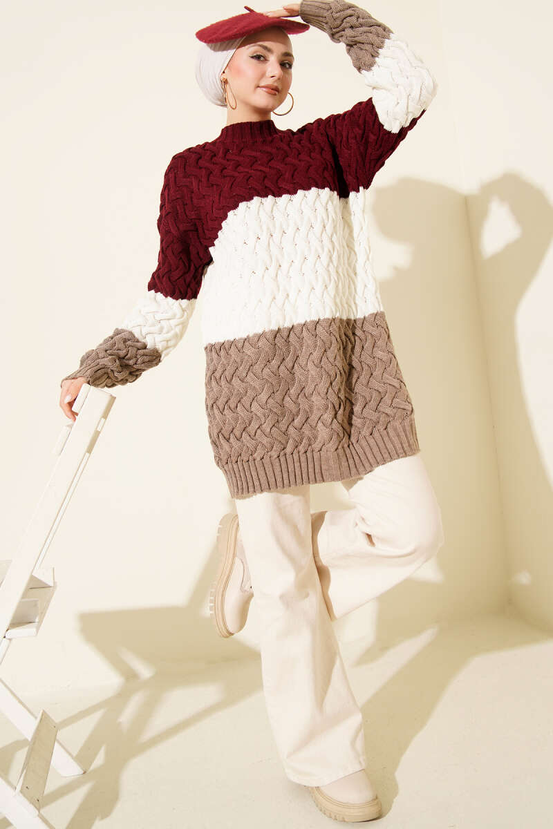 Üç Renkli Örgülü Triko Tunik Bordo
