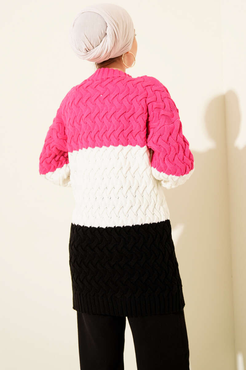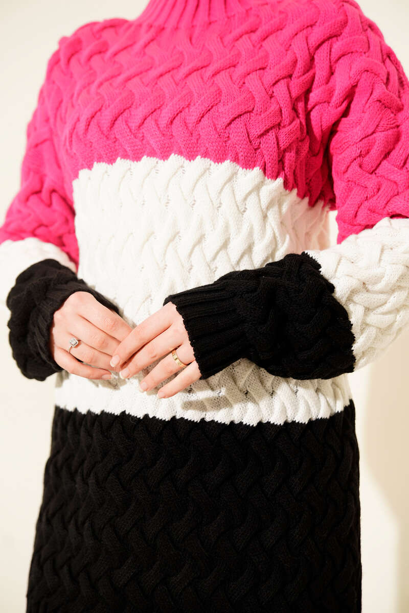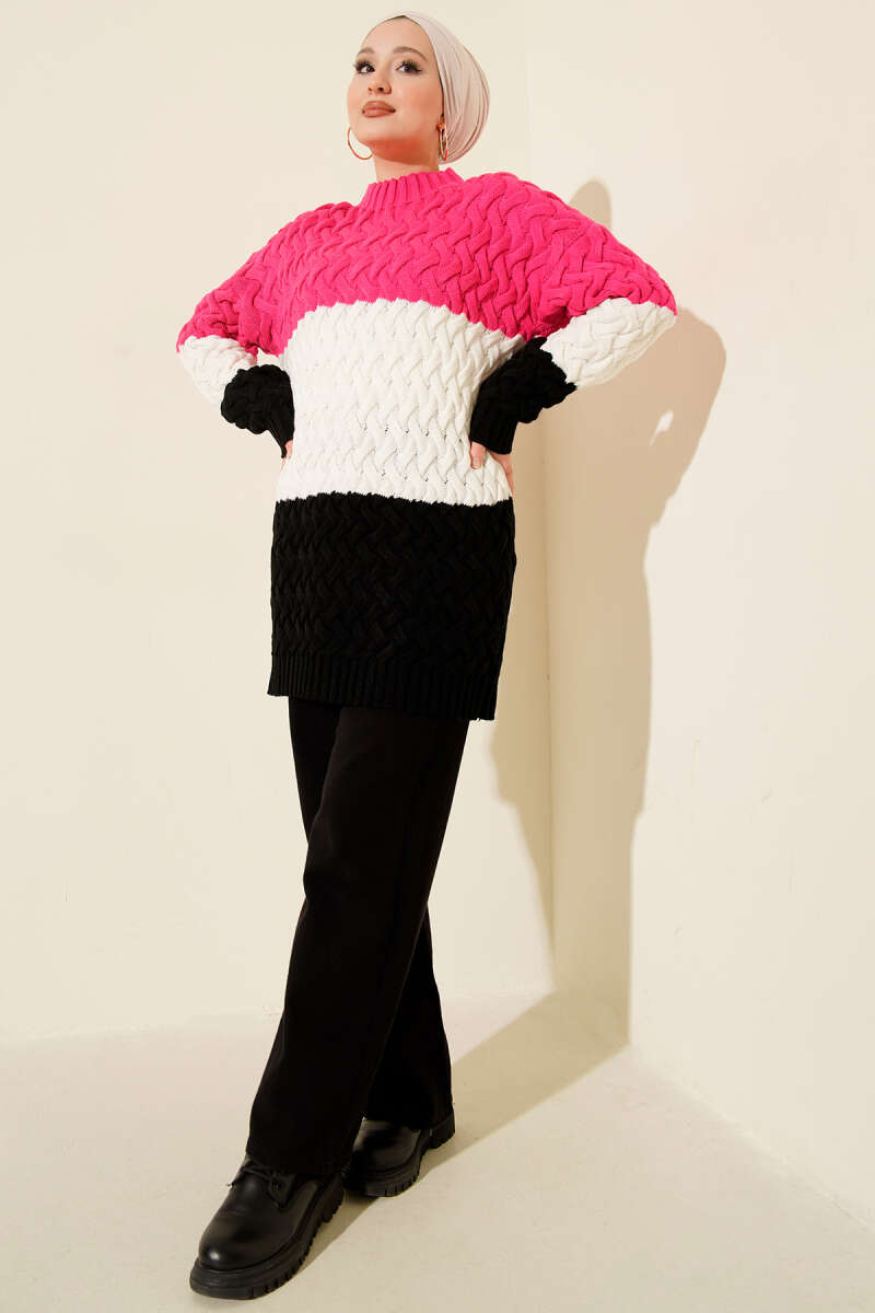 Üç Renkli Örgülü Triko Tunik Fuşya