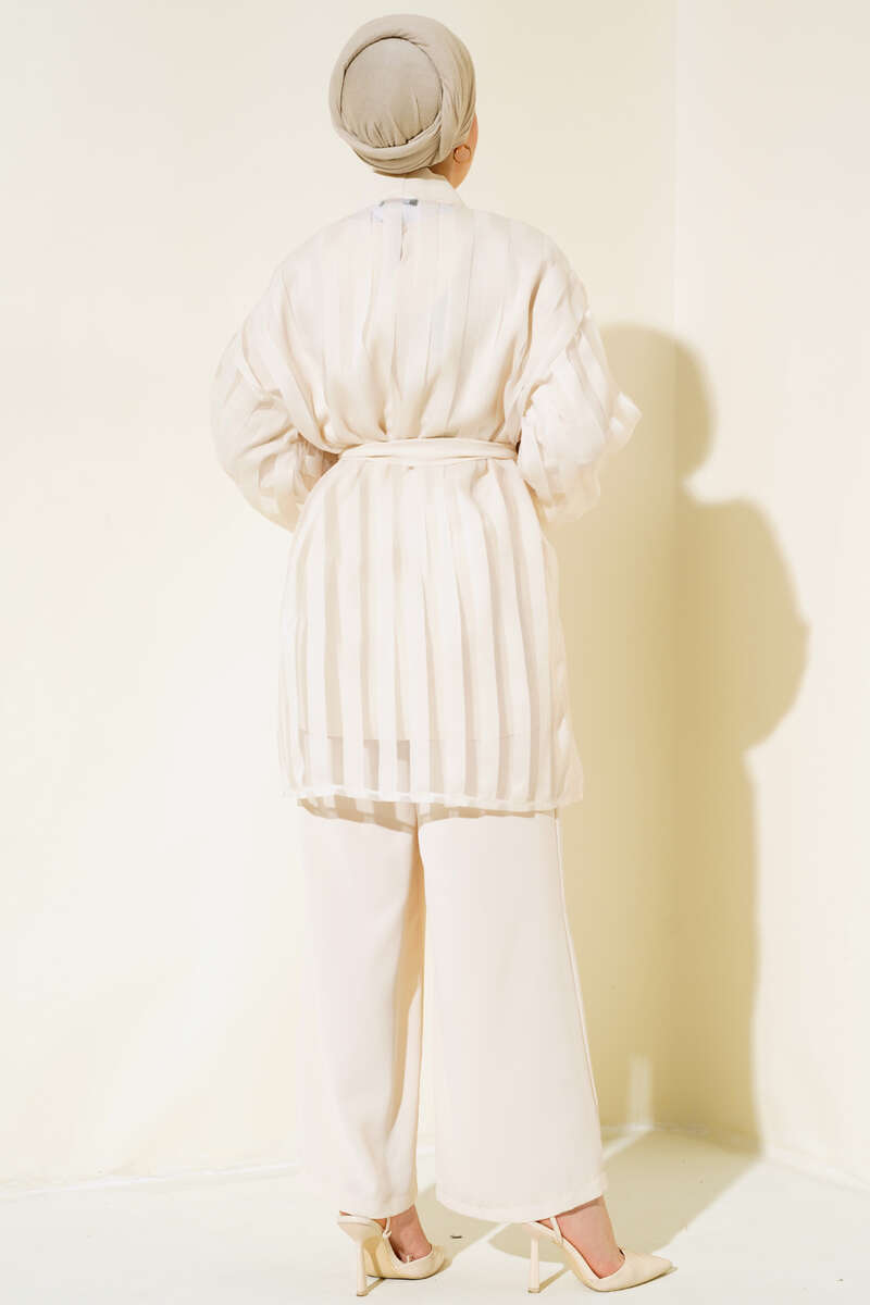 Yeni sezon üçlü takım modelimiz sizlerle beraber. Pantolonun paçası bol paçadır. . Beli lastiklidir. Tuniğimiz salaş ve klasik bir yapıya sahiptir. Arkası düğmelidir. Hırkamız tül hırkadır. Belinde iki adet kemer köprüsü bulunmaktadır. Kendi kumaşından kuşağı bulunur.