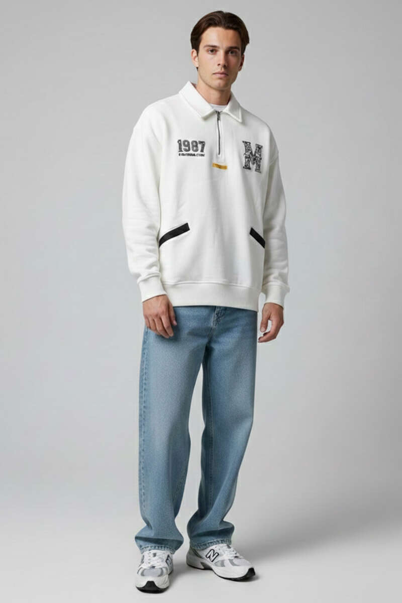 Gömlek Yaka Baskılı Erkek Sweatshirt Ekru