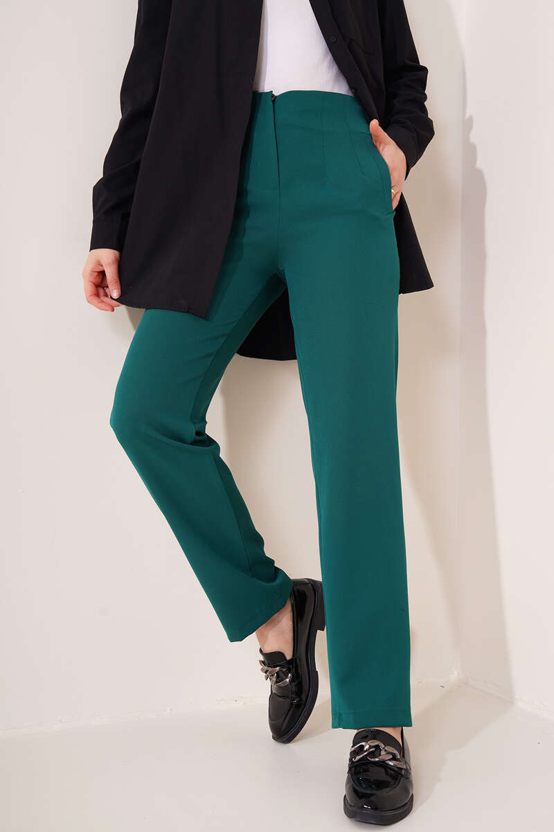 Pantolonumuz yeni sezon modeldir. Yüksel bel olan pantolonumuz önden fermuarlıdır. Yanlarında bulunan iki adet cebi aktif olarak kullanılabilmektedir. Dar paçadır.