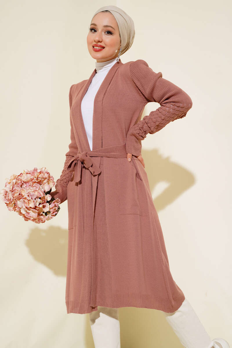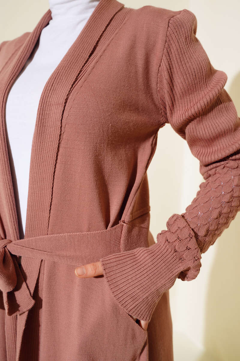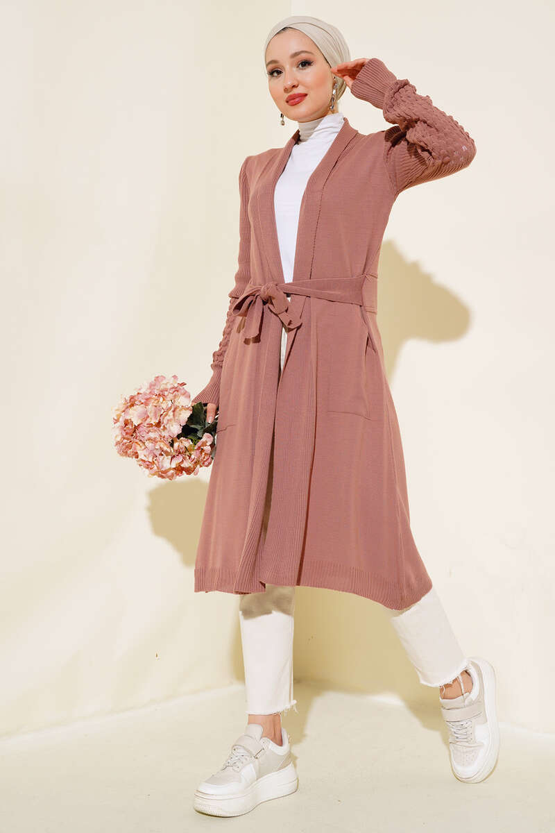 Üzüm Kol Bağcıklı Uzun Hırka Gül Kurusu
