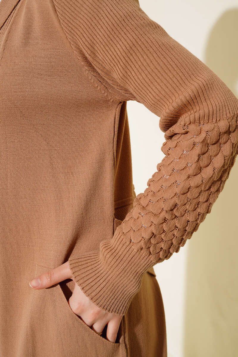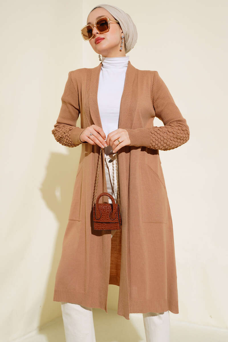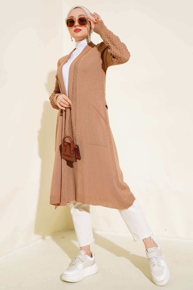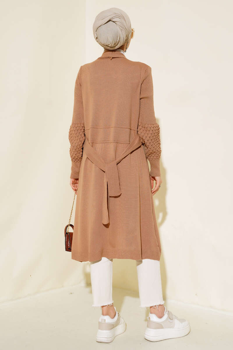 Üzüm Kol Bağcıklı Uzun Hırka Latte