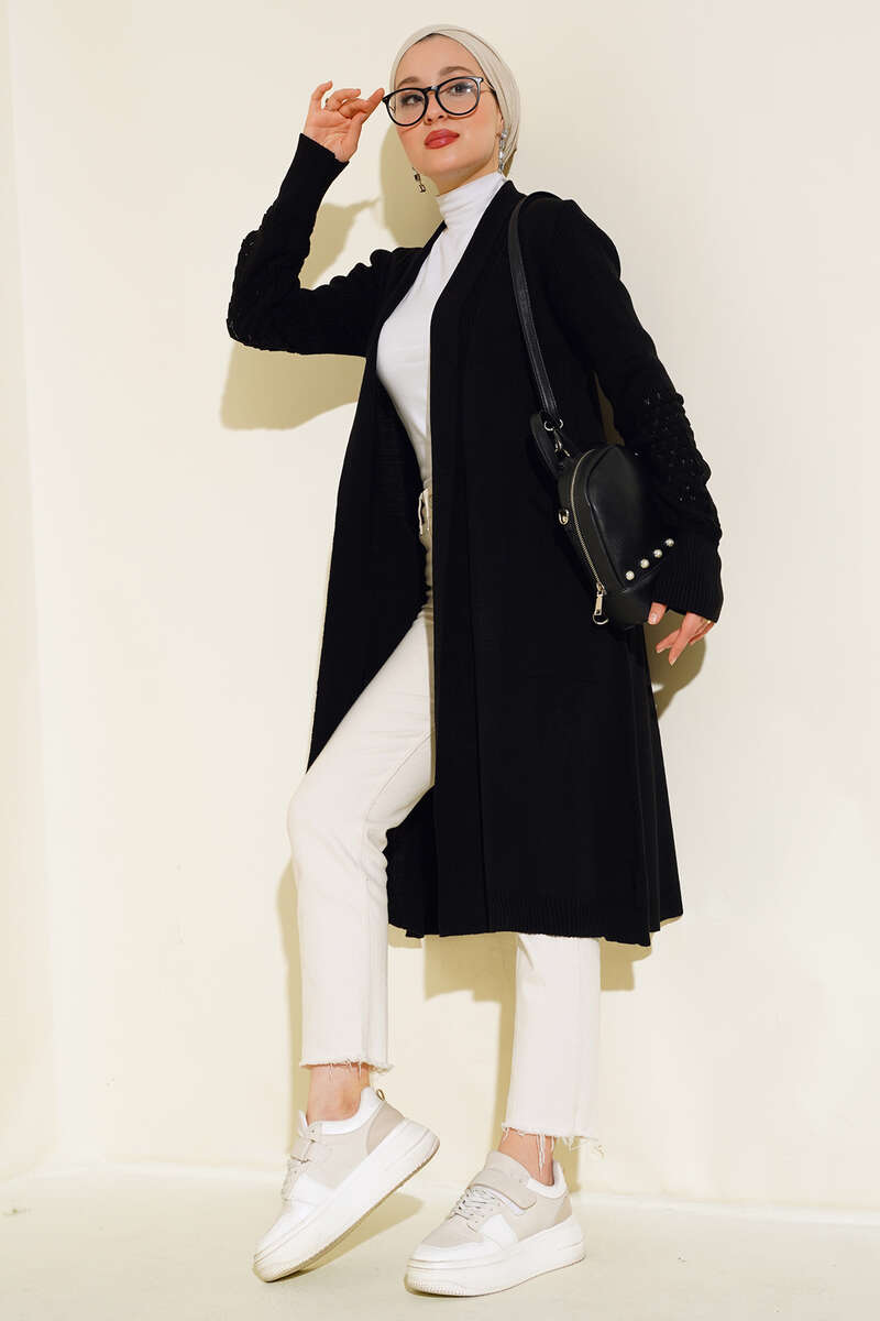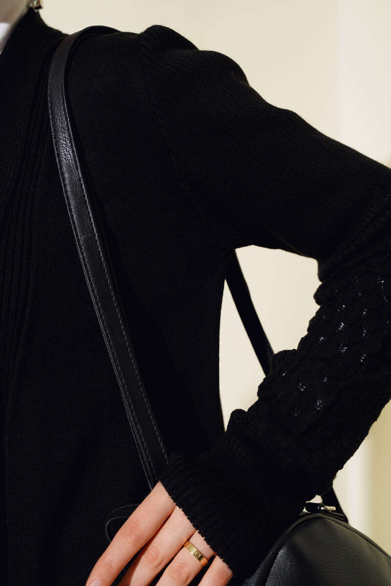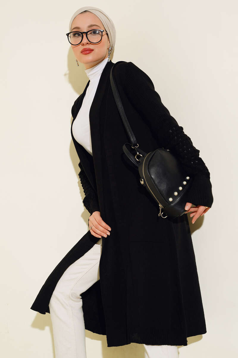Üzüm Kol Bağcıklı Uzun Hırka Siyah