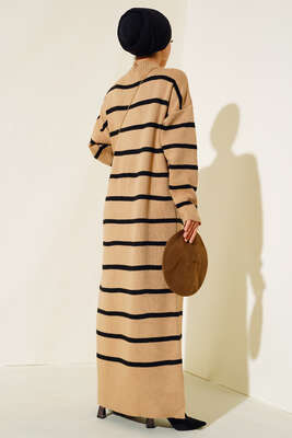 Yeni sezon triko elbisemiz sizlerle beraber. Uzun boy elbisemiz yatay çizgilidir. Triko elbisemizin etek ucu yandan yırtmaçlıdır. Dik yaka elbisemizin renk seçenekleri mevcuttur.