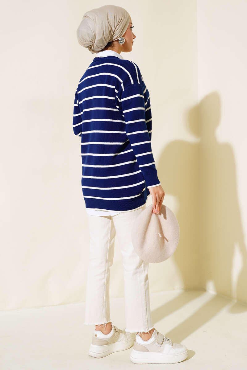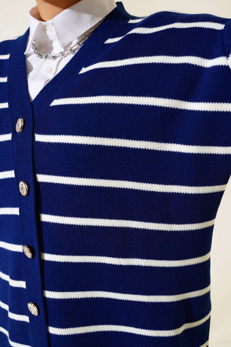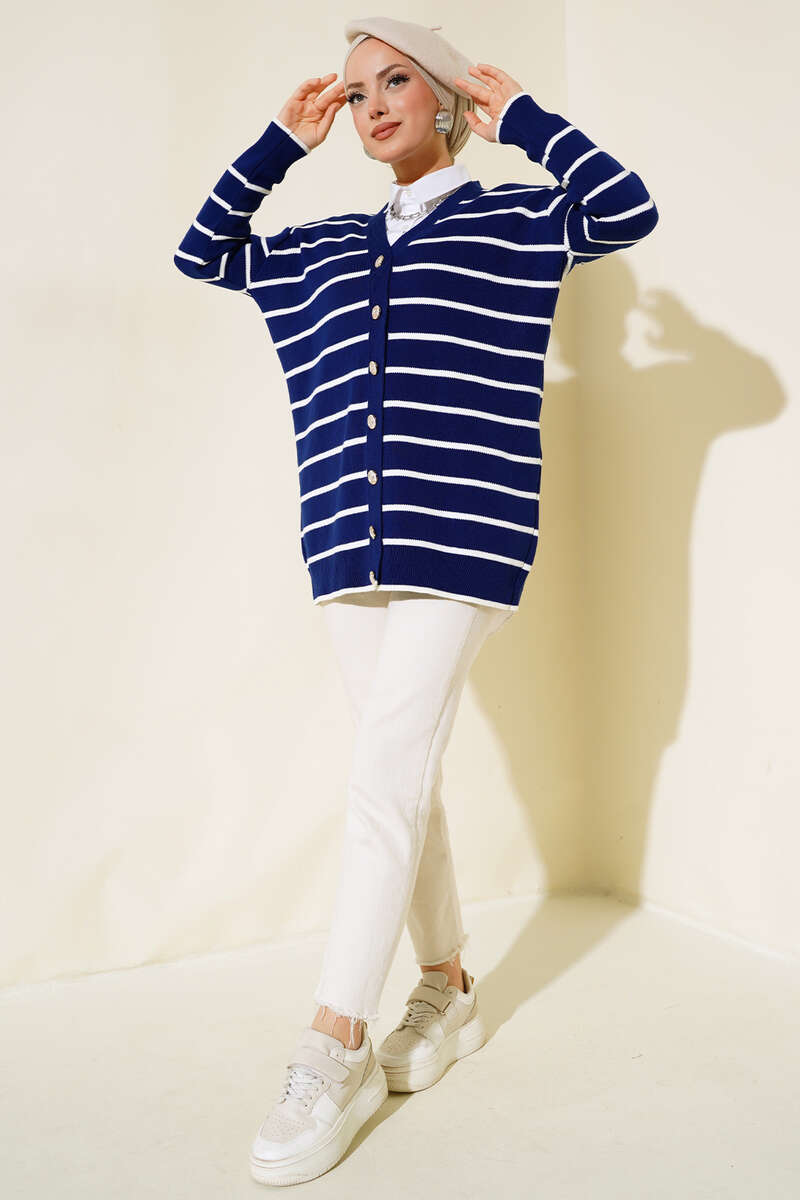 Uzun Düğmeli Çizgili Triko Hırka Lacivert