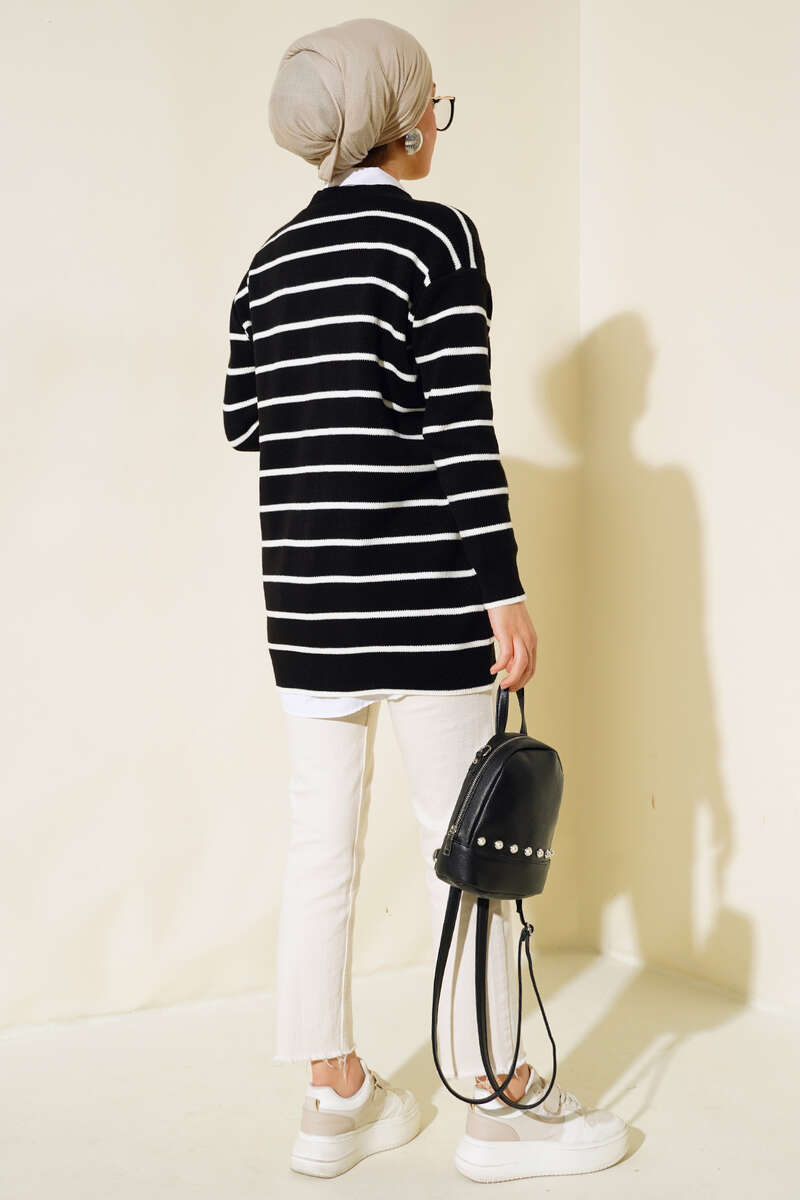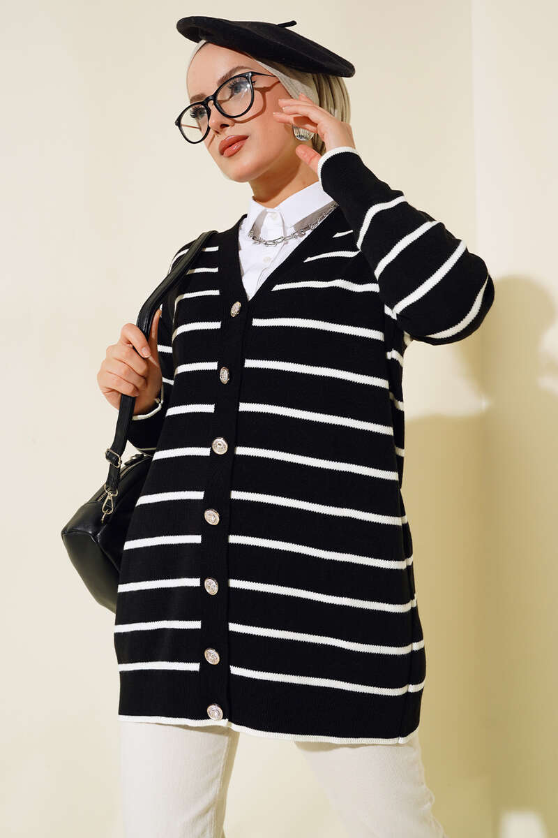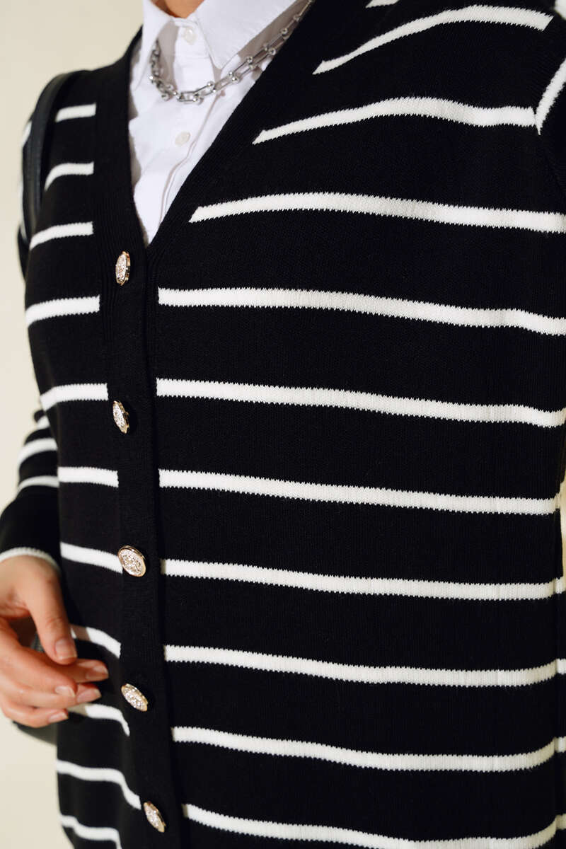 Uzun Düğmeli Çizgili Triko Hırka Siyah