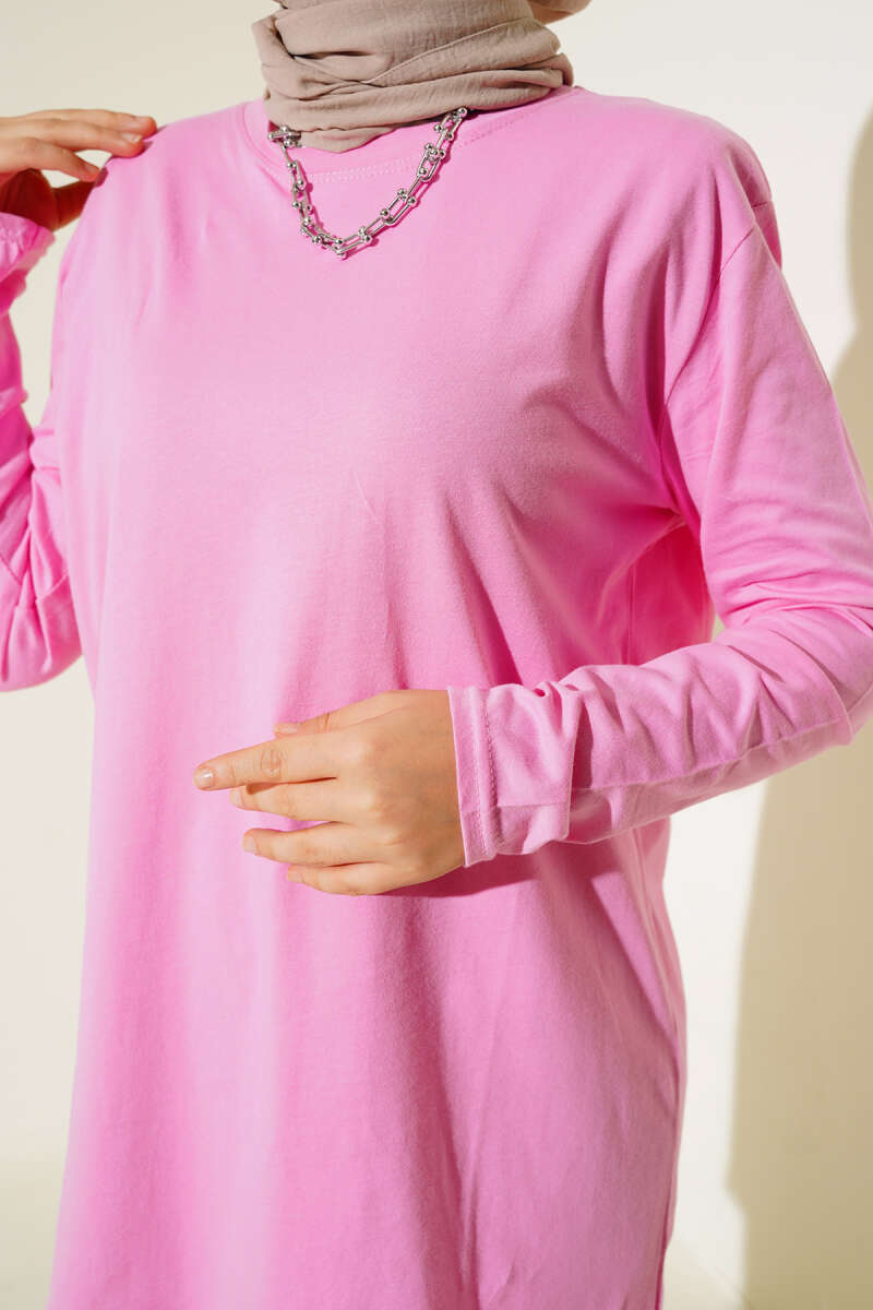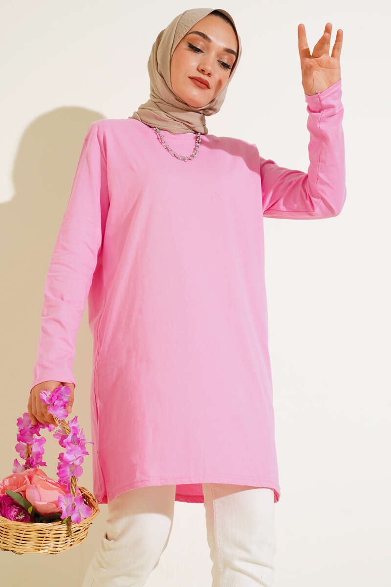 Uzun Kol Basic Tunik Pembe