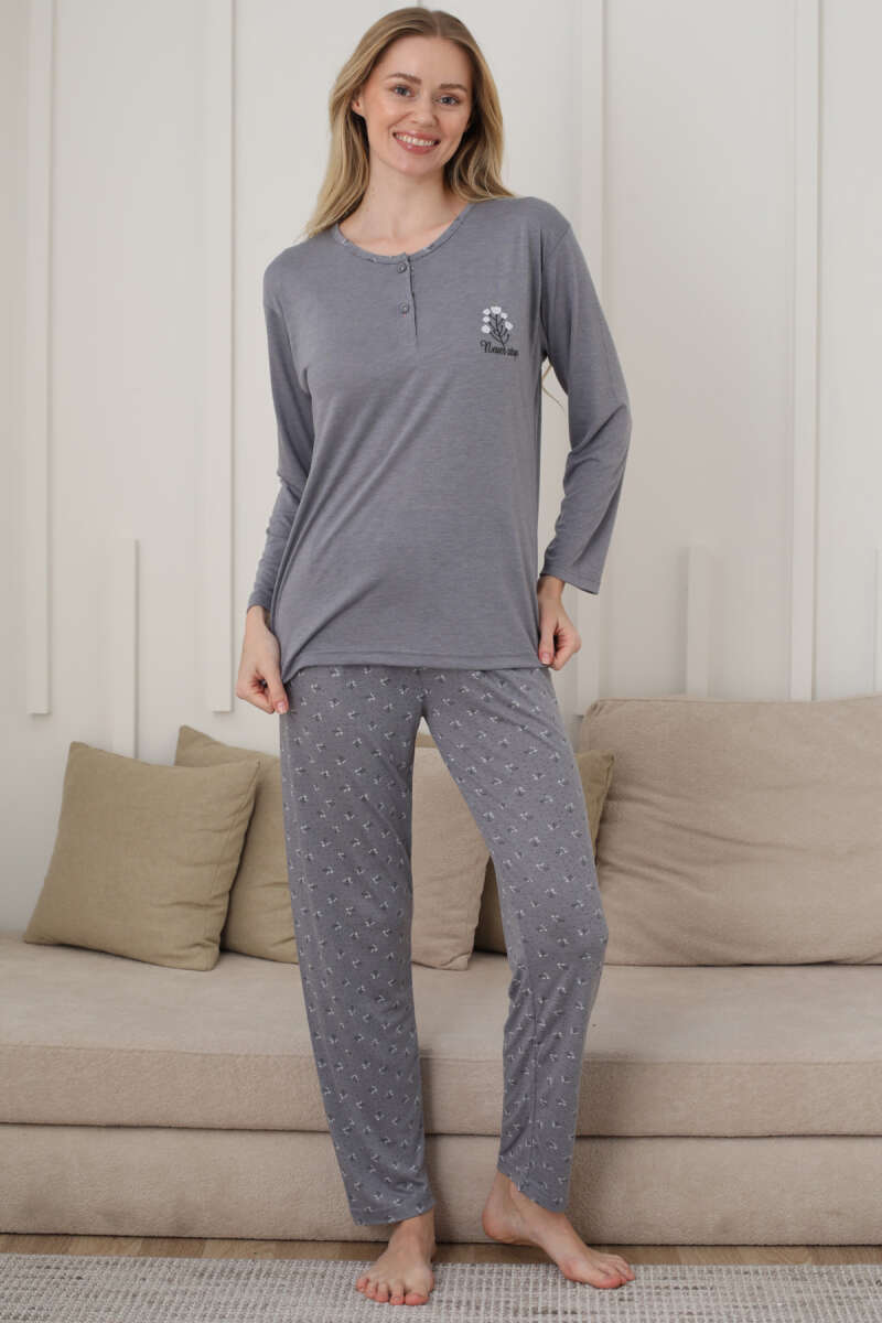 Uzun Kol Kalp Detaylı Düğmeli Pijama Takım Gri