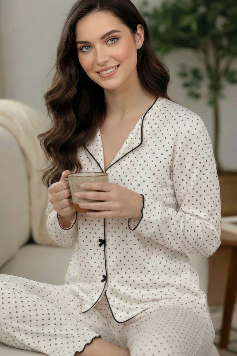 Uzun Kol Önü Kurdeleli Benekli Pijama Takımı Siyah