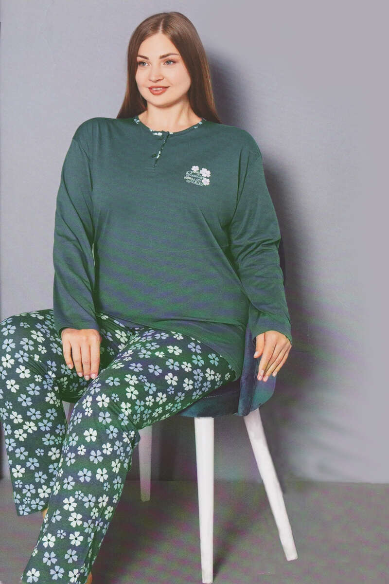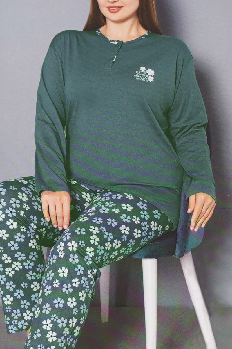 Uzun Kollu Çiçekli Büyük Beden Pijama Takımı Çağla Yeşili
