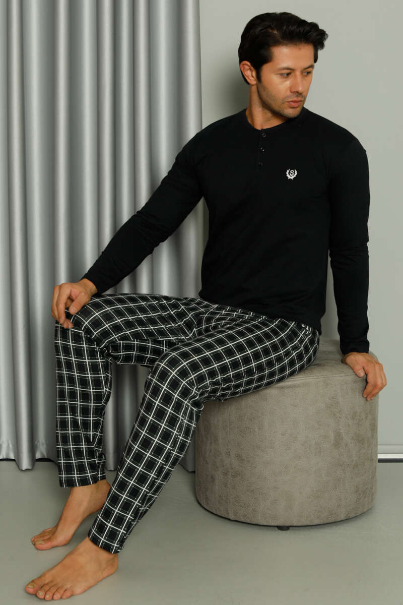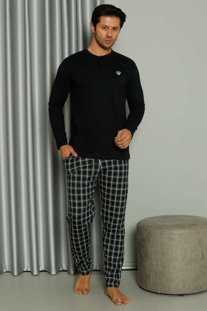 Uzun Kollu Düğmeli Ekoseli Erkek Pijama Takım Lacivert