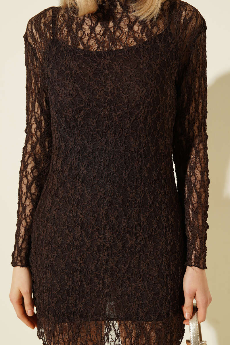 Uzun Kollu Mini Dantel Elbise Kahve