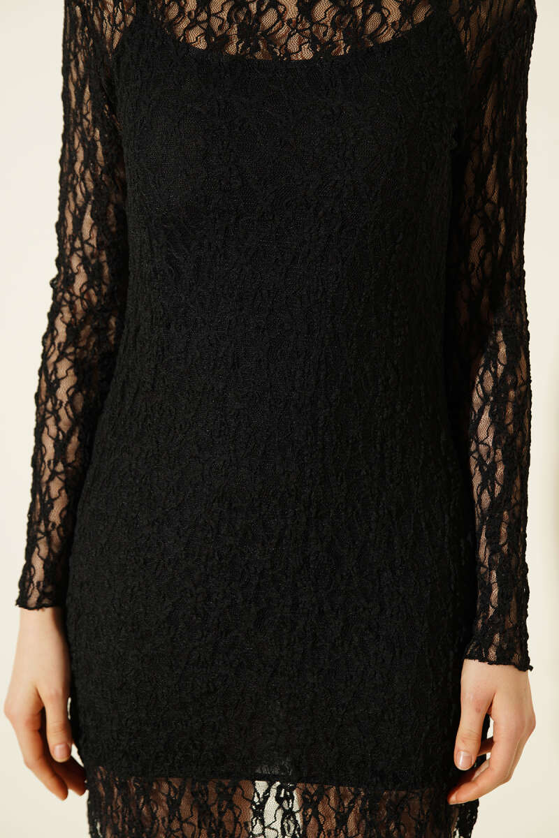 Uzun Kollu Mini Dantel Elbise Siyah