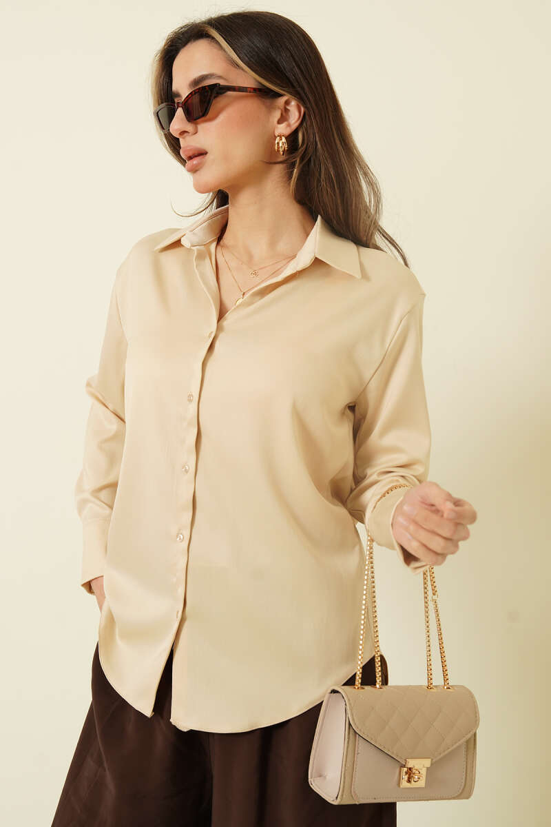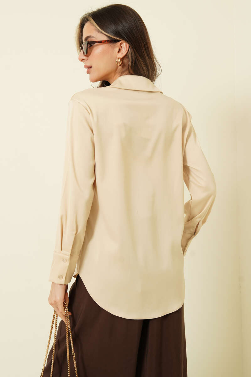 V Yaka Uzun Kol Tensel Bluz Ekru