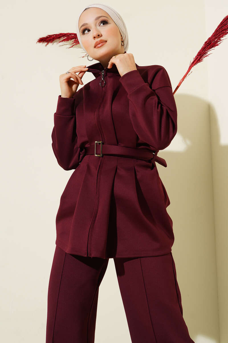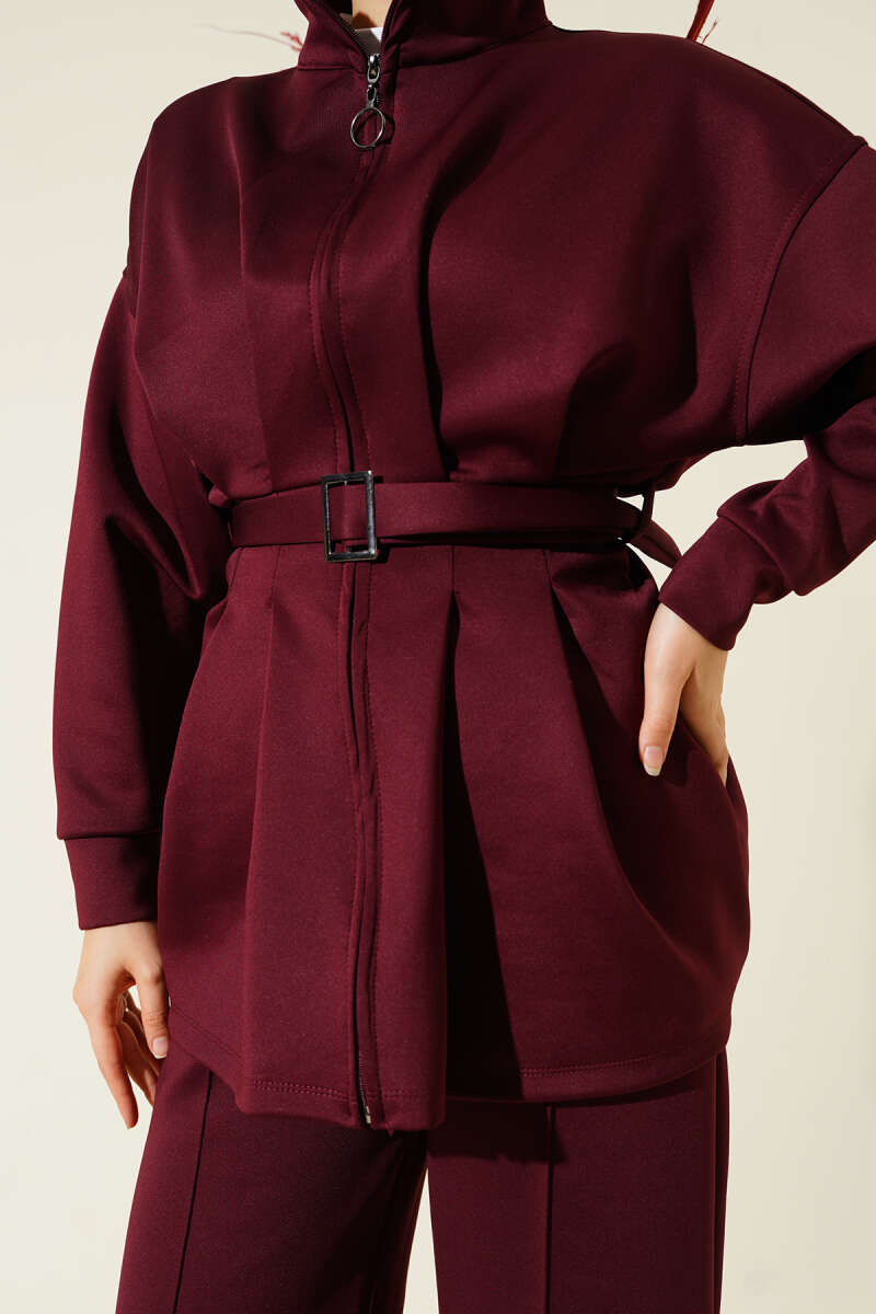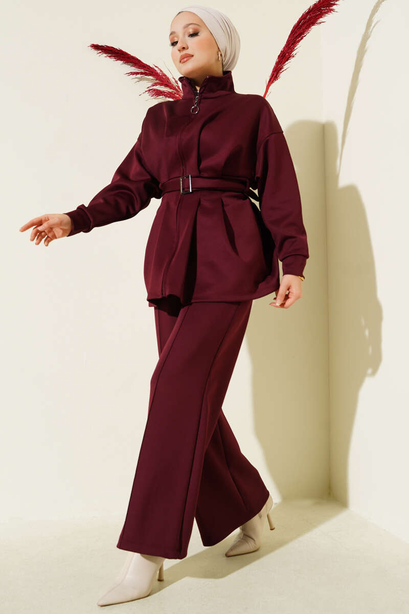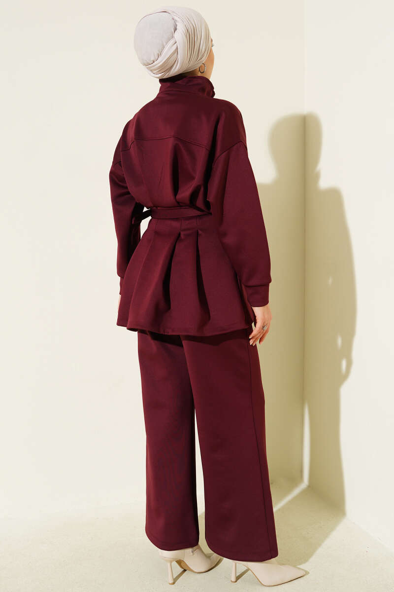 Önü Bağcık Detaylı Etekli İkili Takım Bordo