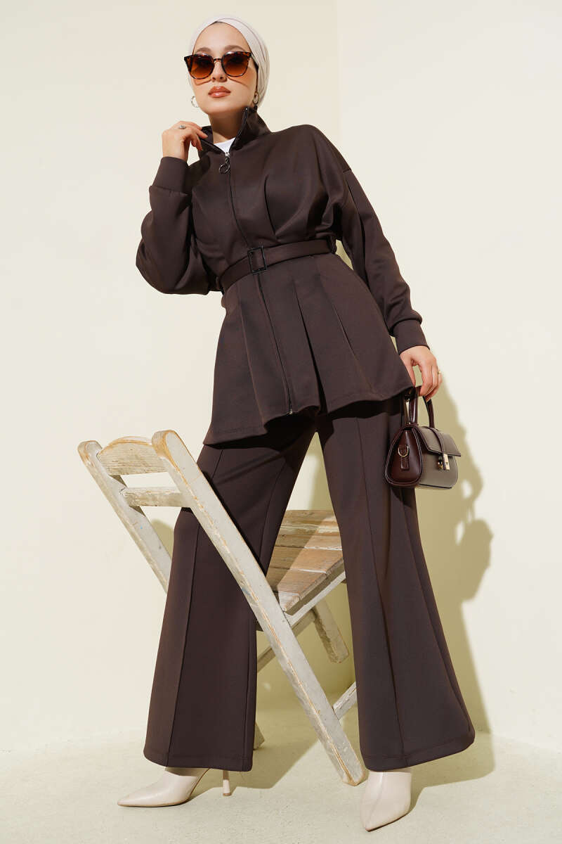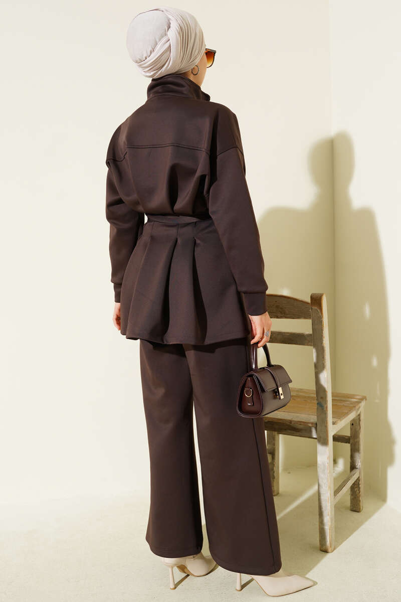 Önü Bağcık Detaylı Etekli İkili Takım Kahve