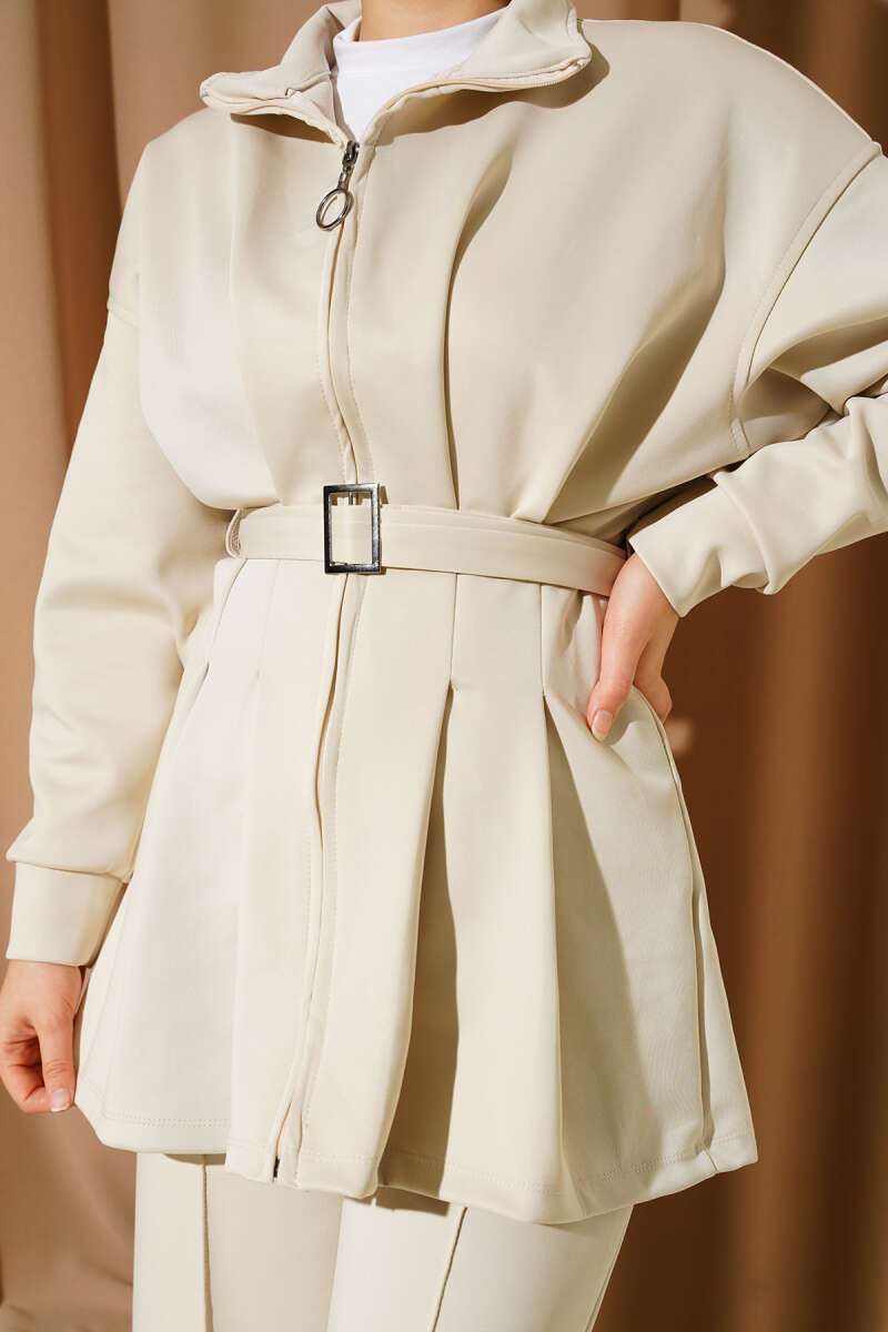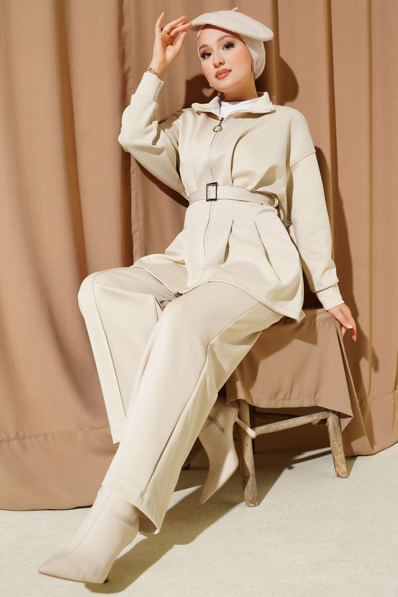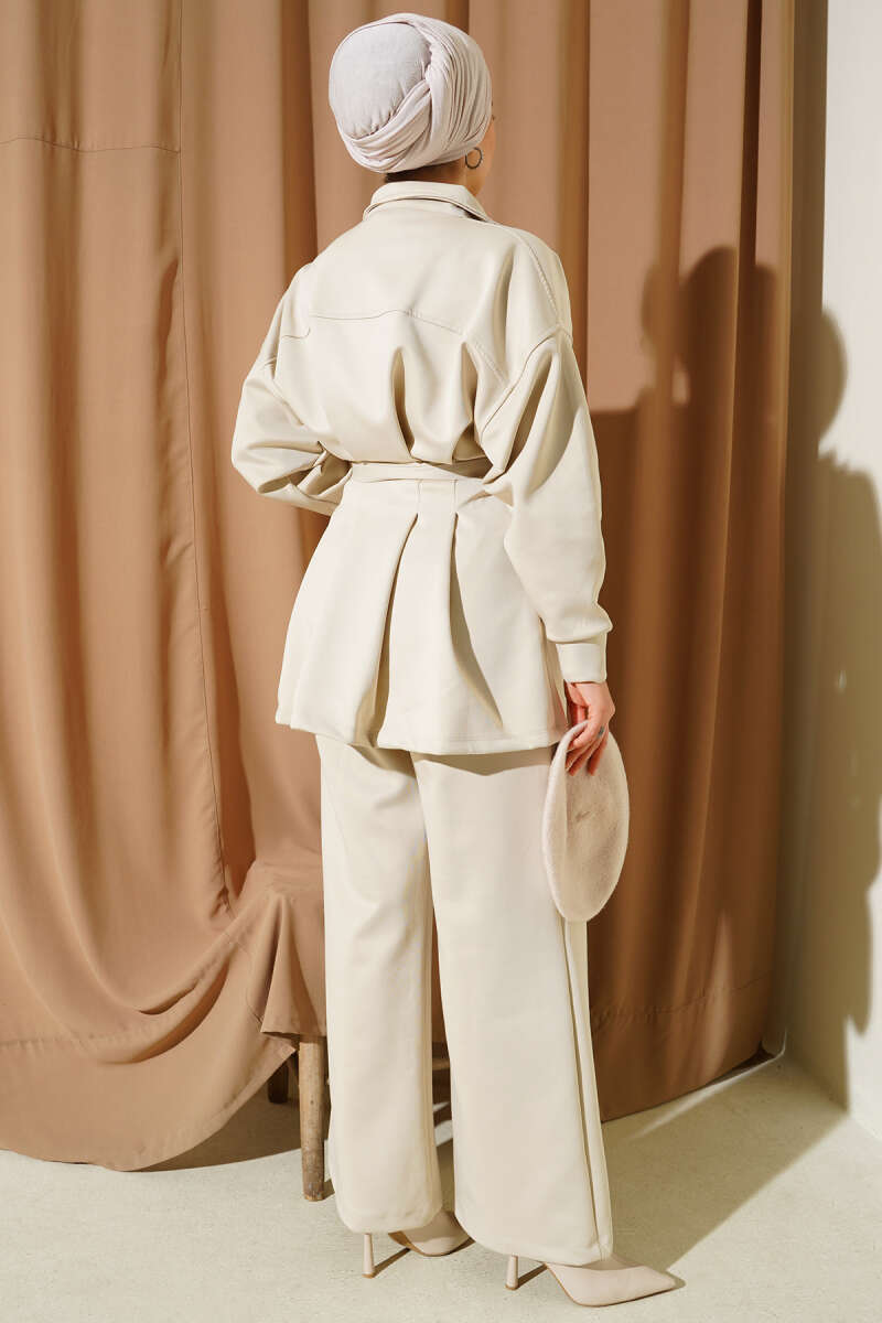 Önü Bağcık Detaylı Etekli İkili Takım Bej