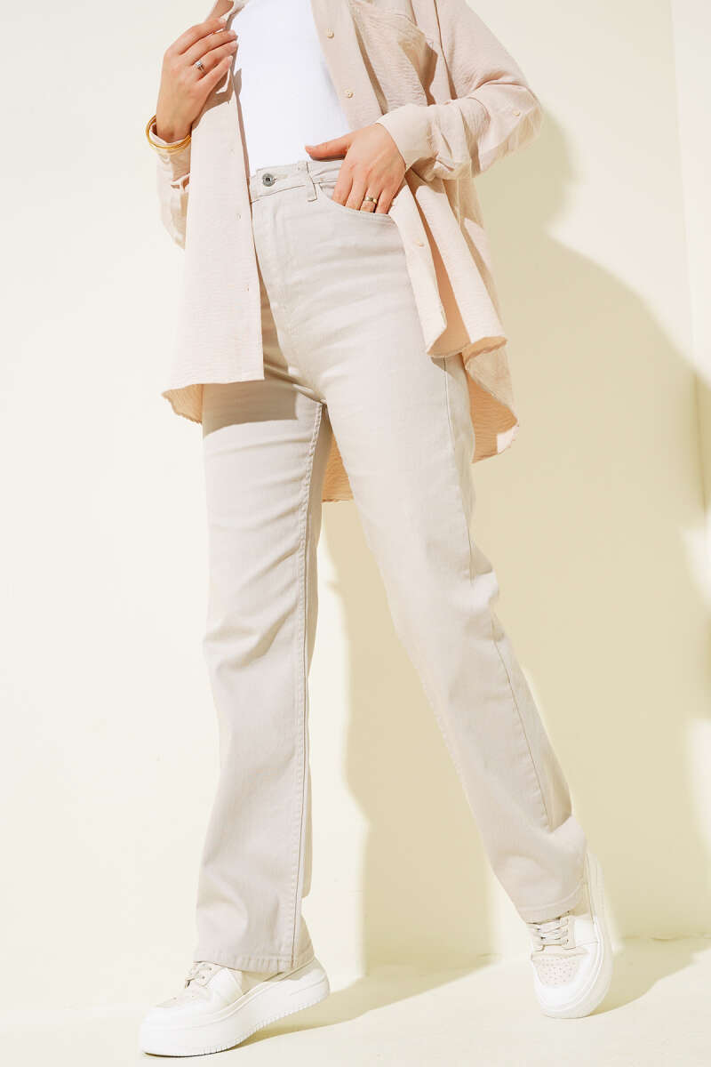 Geniş Paça Düğmeli Kot Pantolon Açık Kar