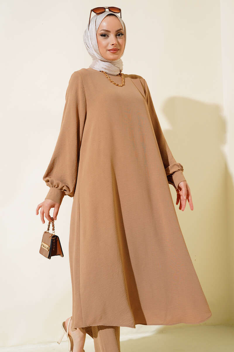 Yeni sezon ikili takım modelimiz sizlerle beraber. Tuniğimiz uzun salaş modeldir. Enseden düğmelidir. Kol bilekleri manşetli ve düğmelidir. Pantolonumuzun beli lastiklidir. Geniş paçalıdır. Cepsiz modeldir. Renk seçenekleri olan ikili takımımız sizleri bekliyor.