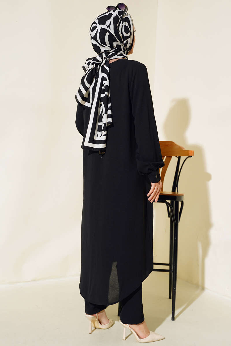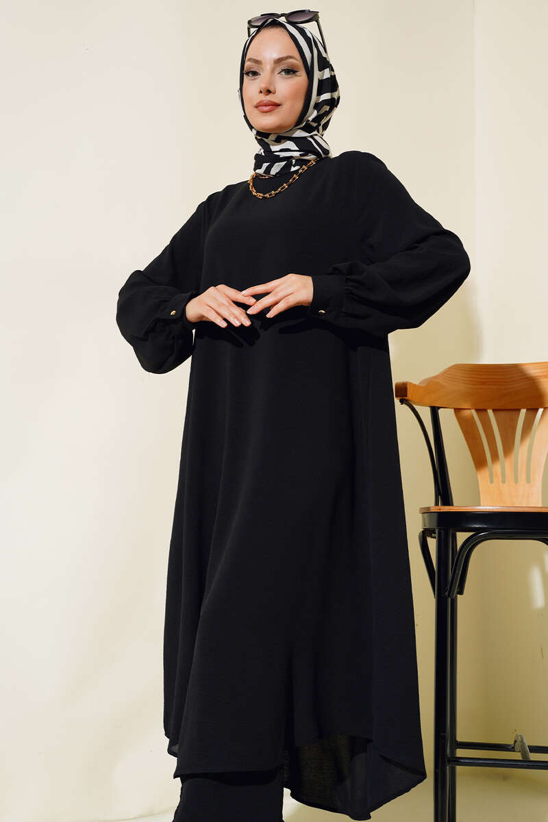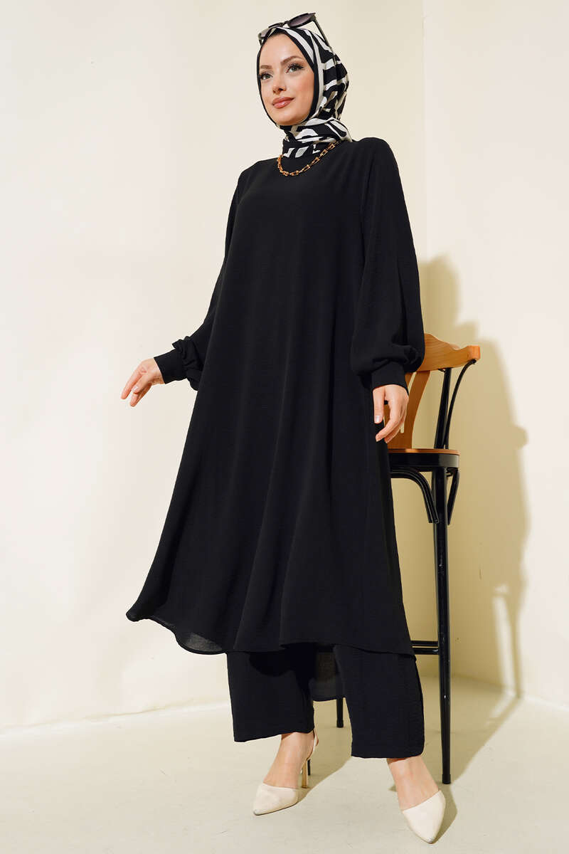 Yeni sezon ikili takım modelimiz sizlerle beraber. Tuniğimiz uzun salaş modeldir. Enseden düğmelidir. Kol bilekleri manşetli ve düğmelidir. Pantolonumuzun beli lastiklidir. Geniş paçalıdır. Cepsiz modeldir. Renk seçenekleri olan ikili takımımız sizleri bekliyor.