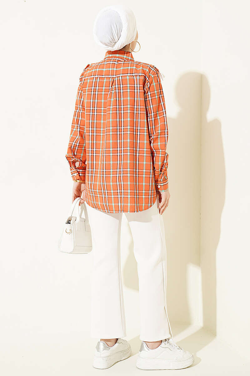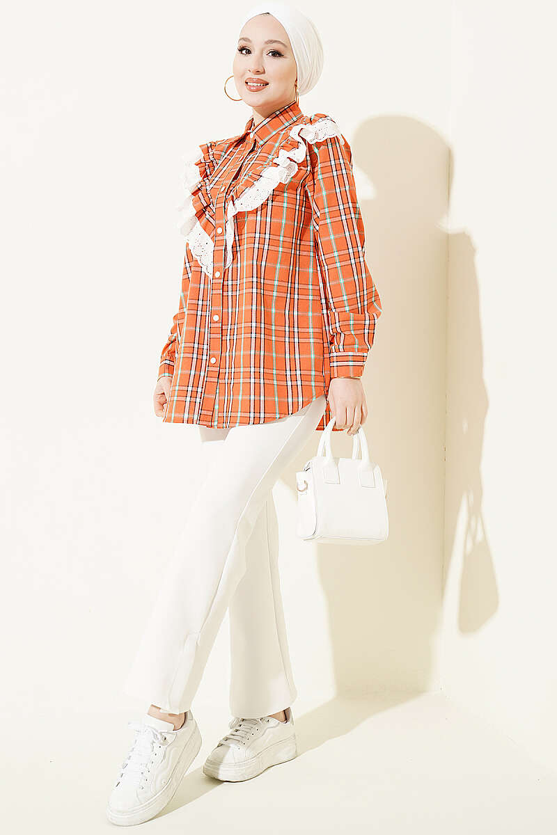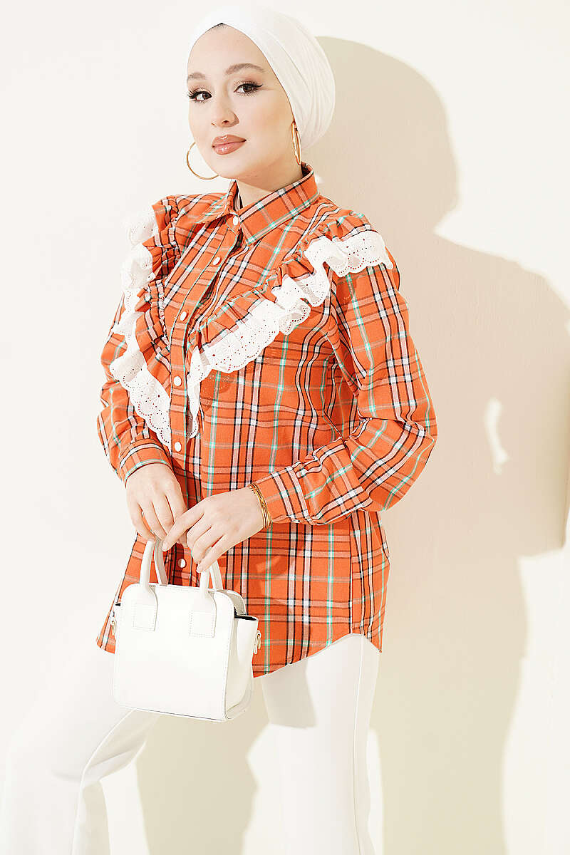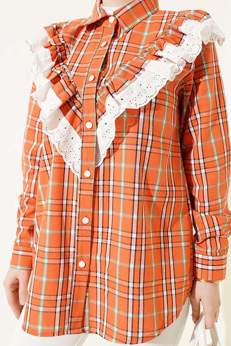 Bu şık gömlek, klasik ekose desenini modern ve feminen detaylarla birleştirerek günlük kombinlerinize hareket katıyor. Göğüs kısmında yer alan V formundaki brode fırfır detayları, tasarıma zarif bir doku ve vintage bir hava kazandırıyor. Rahat kesimi ve düğmeli yapısı sayesinde hem konforlu bir kullanım sunuyor hem de farklı alt giyim parçalarıyla kolayca uyum sağlıyor. Tasarımın dinamik çizgileri, stilinde hem geleneksel hem de yenilikçi detayları sevenler için ideal bir tercih oluşturuyor.
