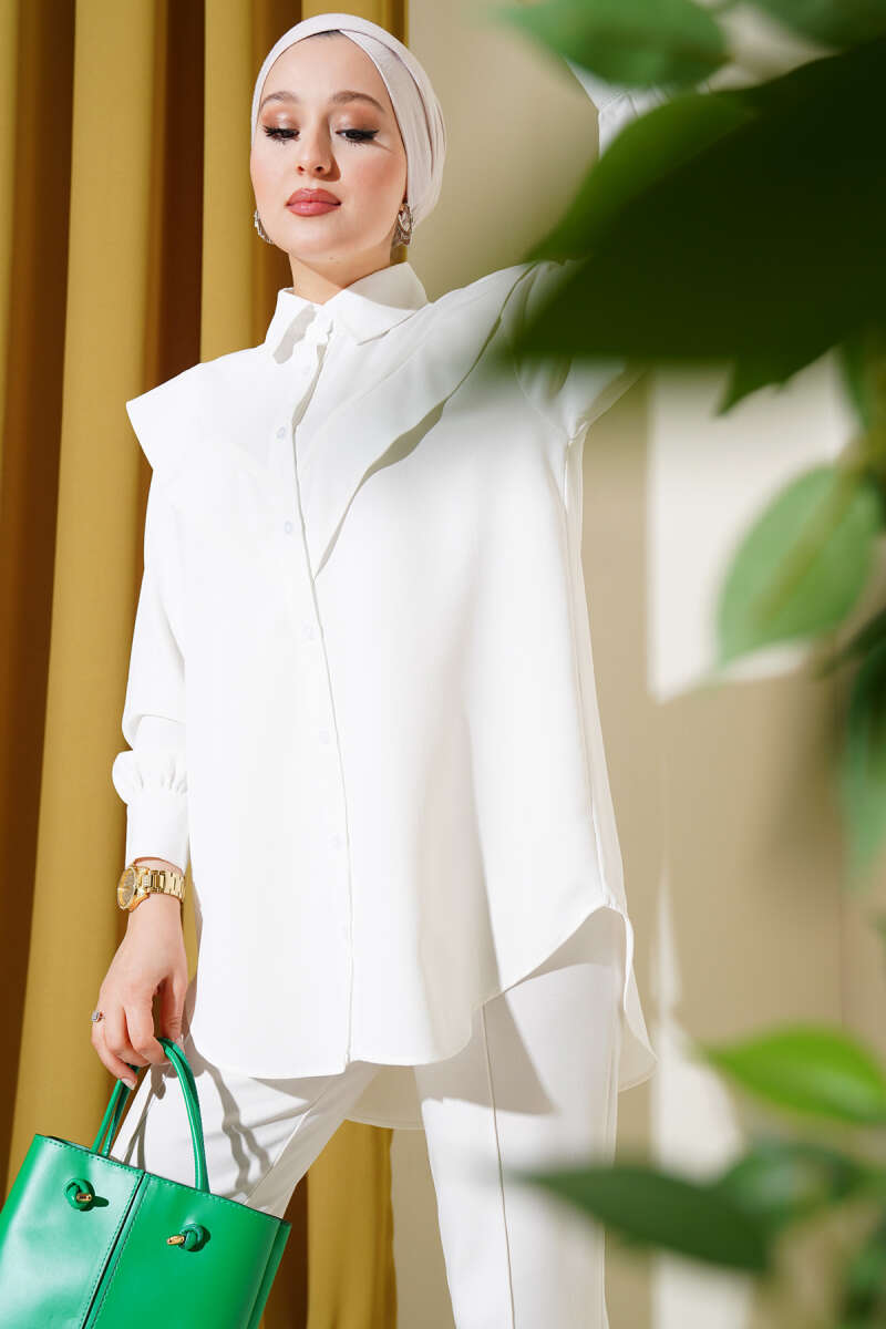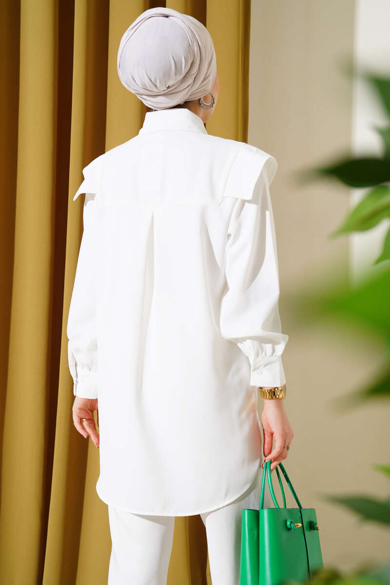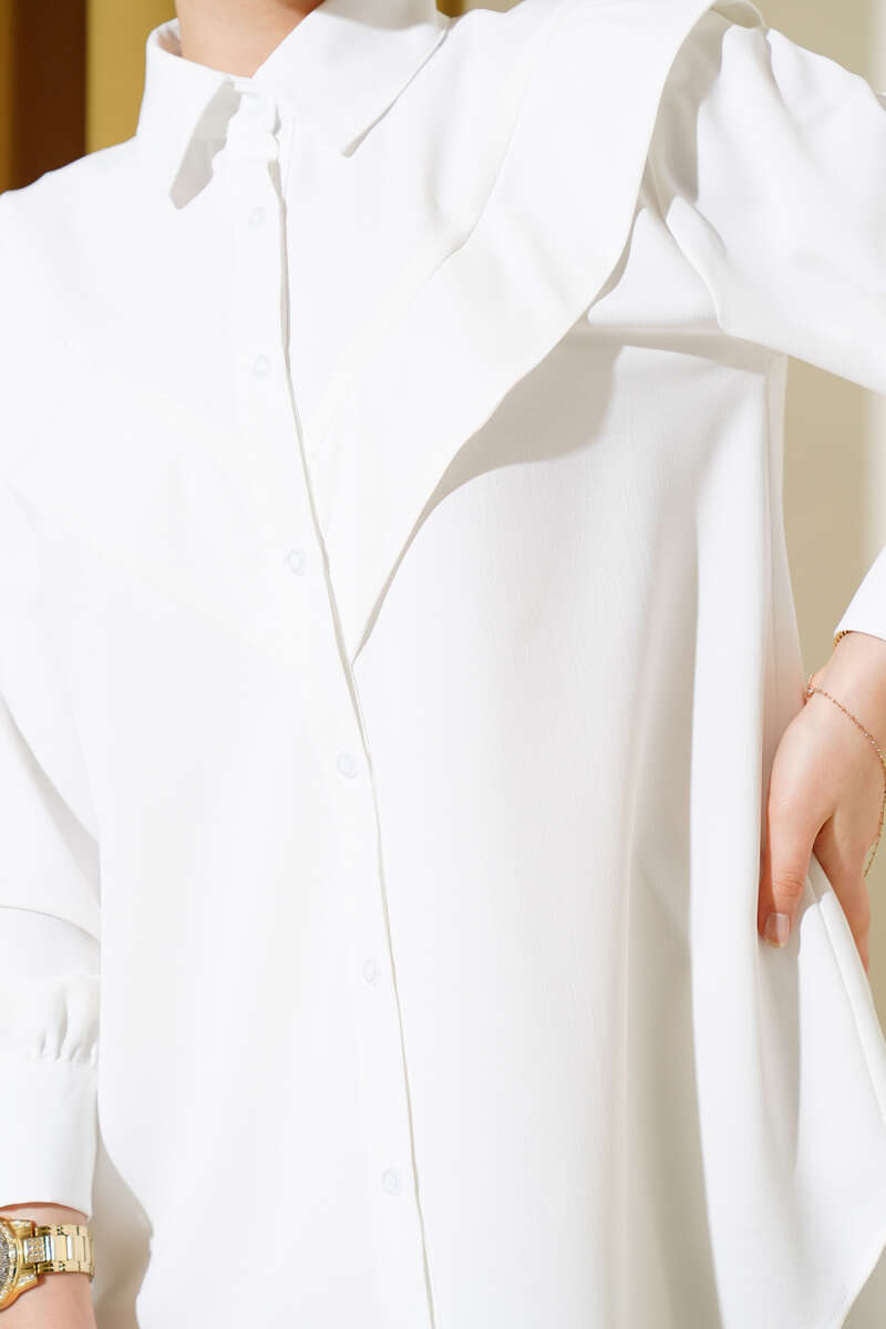 Gizli Düğmeli Bel Kuşaklı Gömlek Beyaz