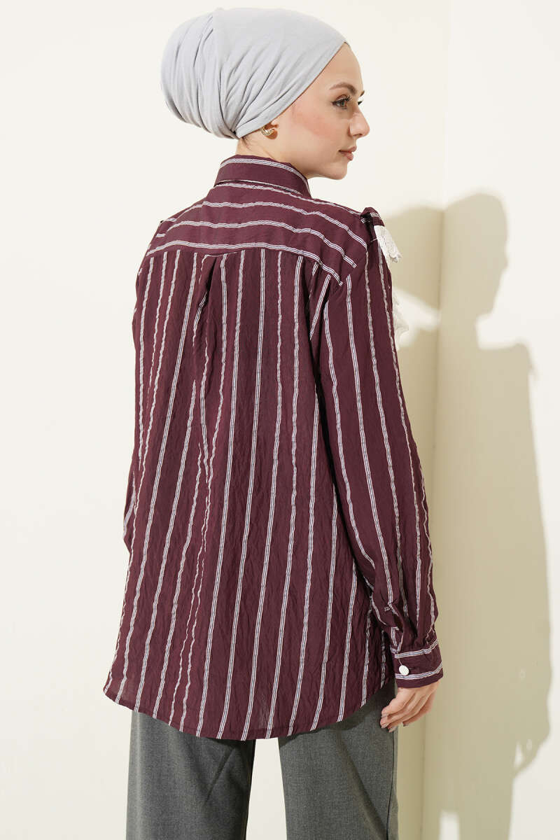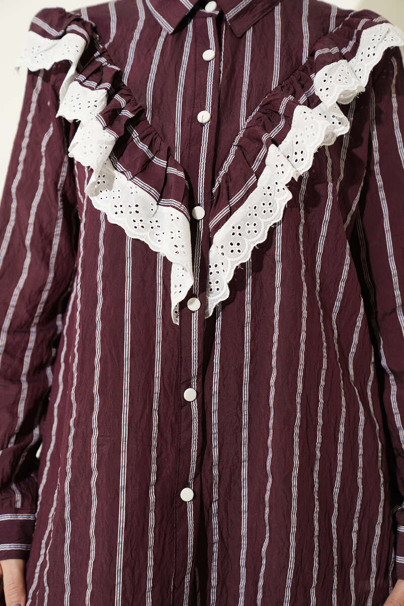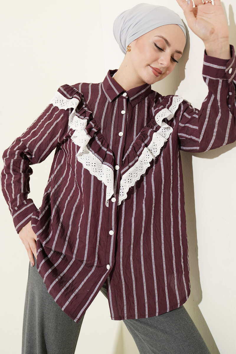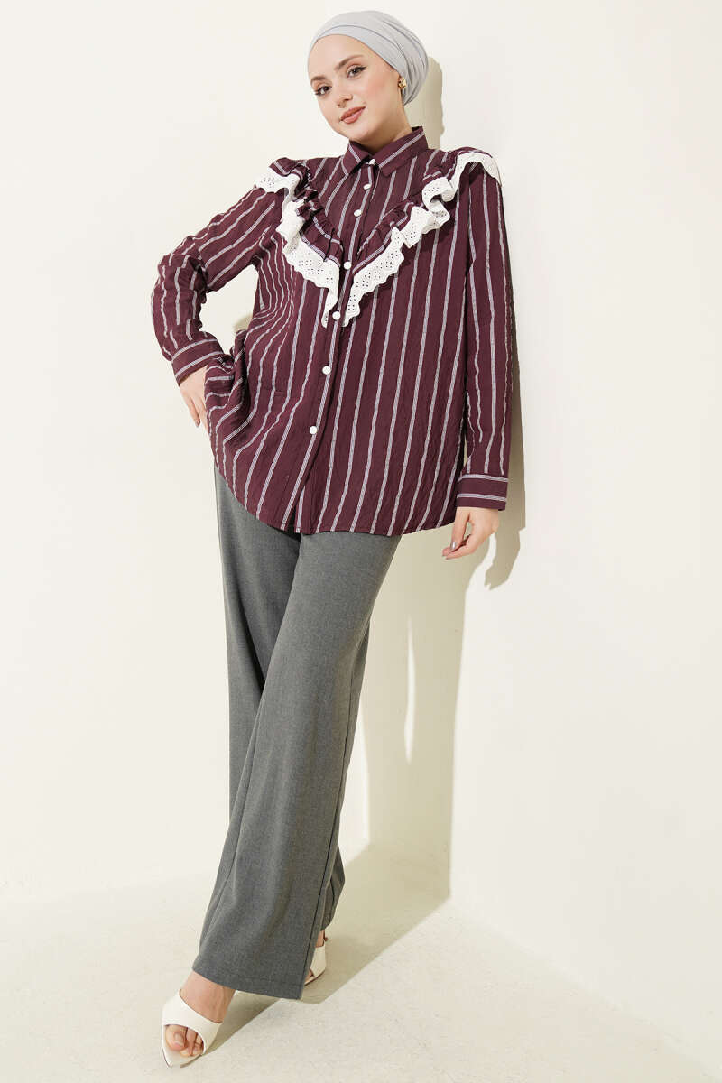 Dikey çizgili deseniyle modern bir duruş sergileyen bu gömlek, ön kısmındaki romantik fisto ve volan detaylarıyla fark yaratıyor. Klasik gömlek yakası ve boydan düğmeli kapanışı, zarif tasarımı fonksiyonel bir kullanım ile birleştiriyor.