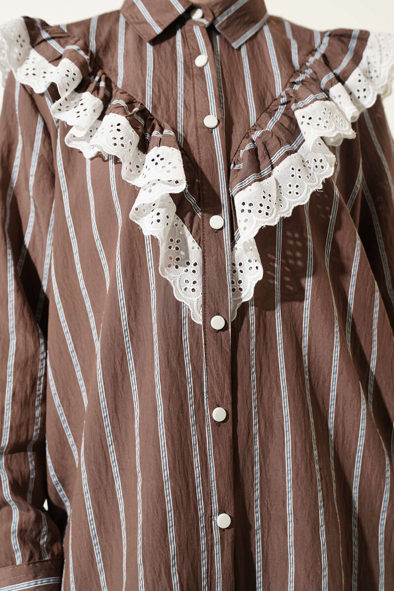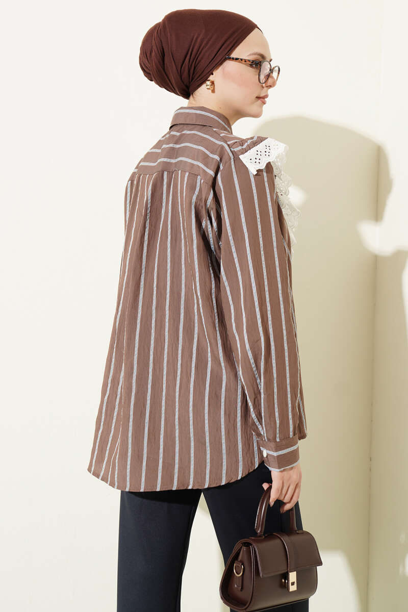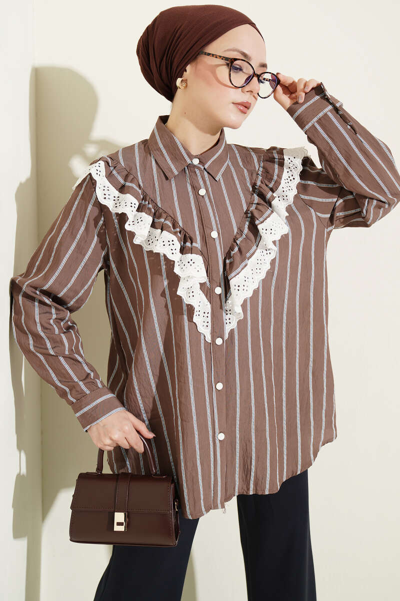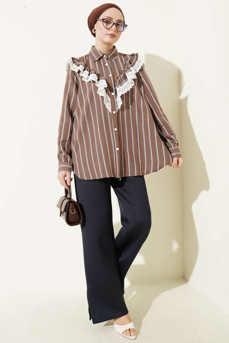 Gelince Haber VerDikey çizgili deseniyle modern bir duruş sergileyen bu gömlek, ön kısmındaki romantik fisto ve volan detaylarıyla fark yaratıyor. Klasik gömlek yakası ve boydan düğmeli kapanışı, zarif tasarımı fonksiyonel bir kullanım ile birleştiriyor.
