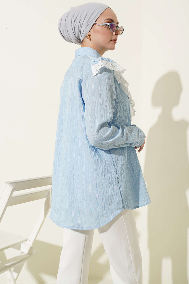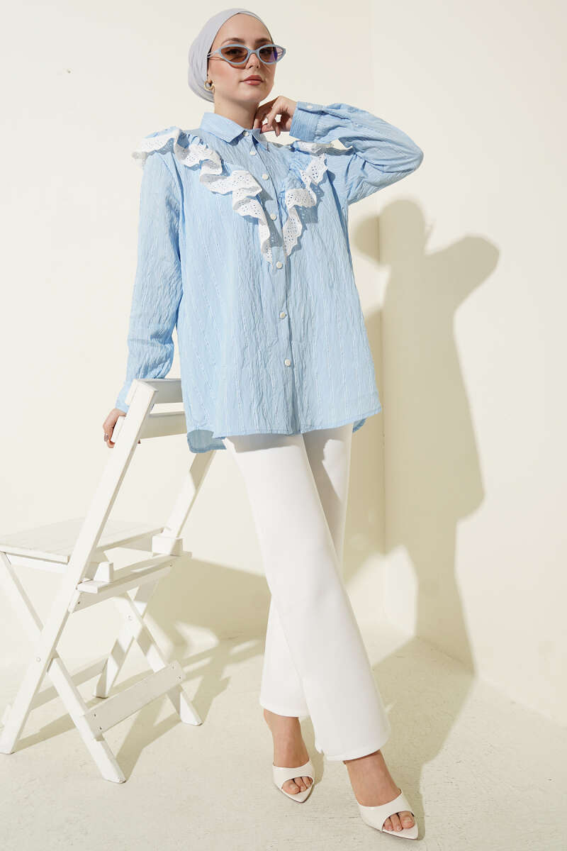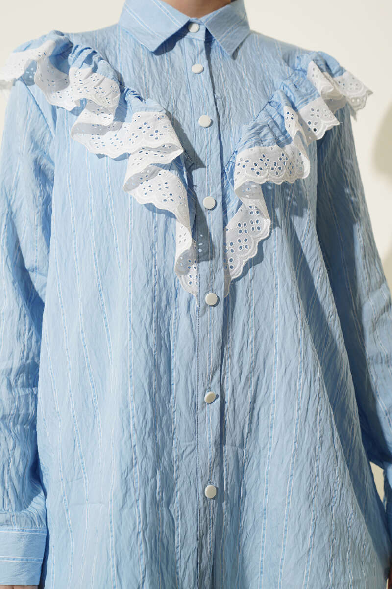 Dikey çizgili deseniyle modern bir duruş sergileyen bu gömlek, ön kısmındaki romantik fisto ve volan detaylarıyla fark yaratıyor. Klasik gömlek yakası ve boydan düğmeli kapanışı, zarif tasarımı fonksiyonel bir kullanım ile birleştiriyor.