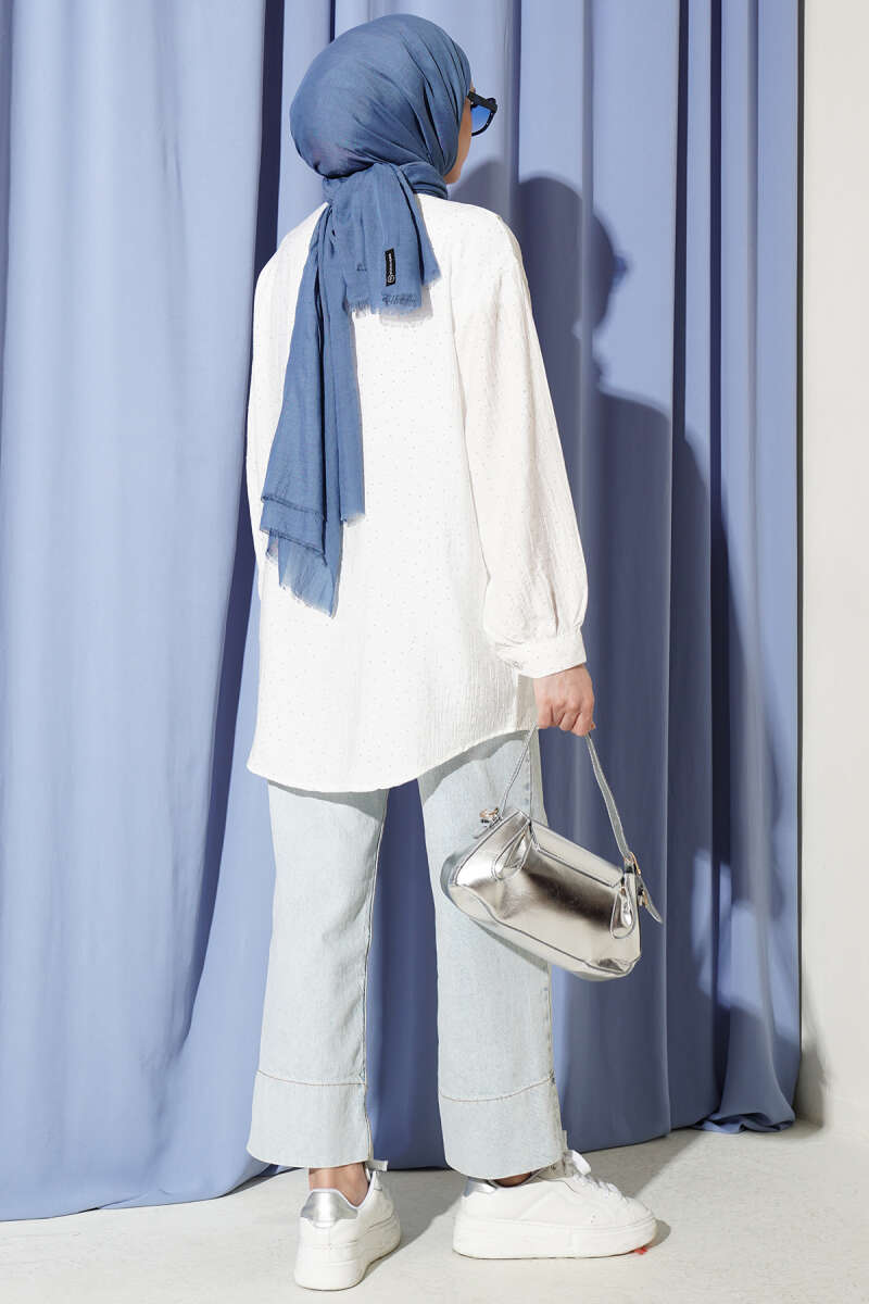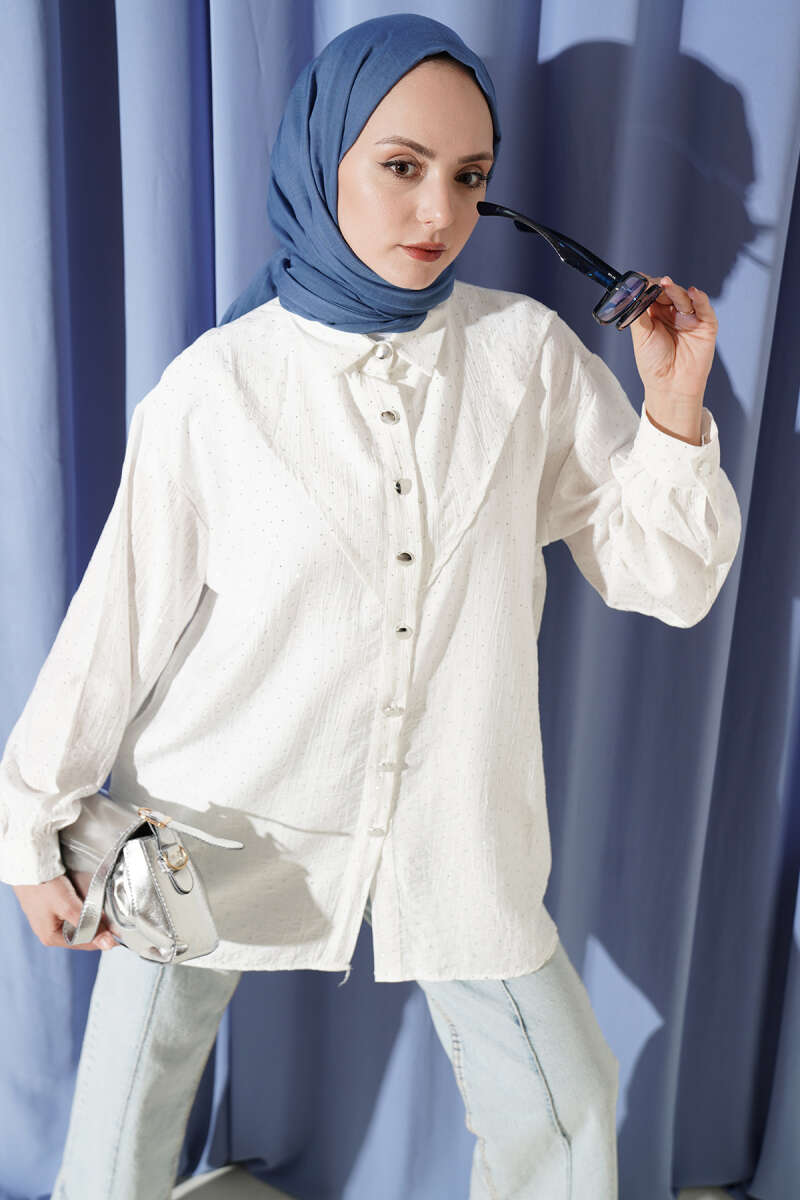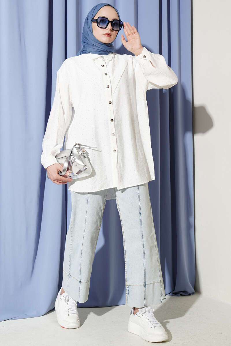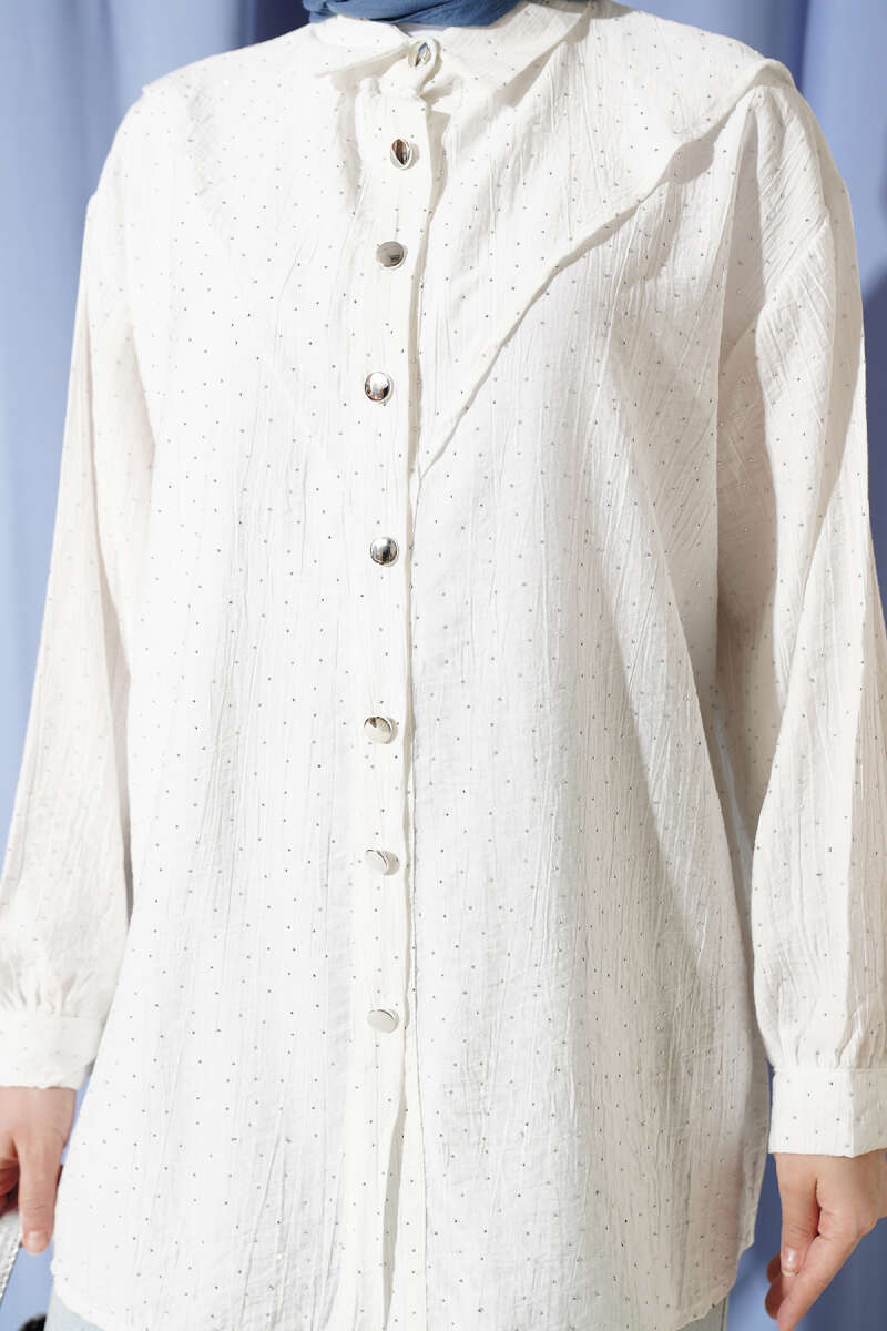 V Parçalı Taş Süslemeli Gömlek Ekru