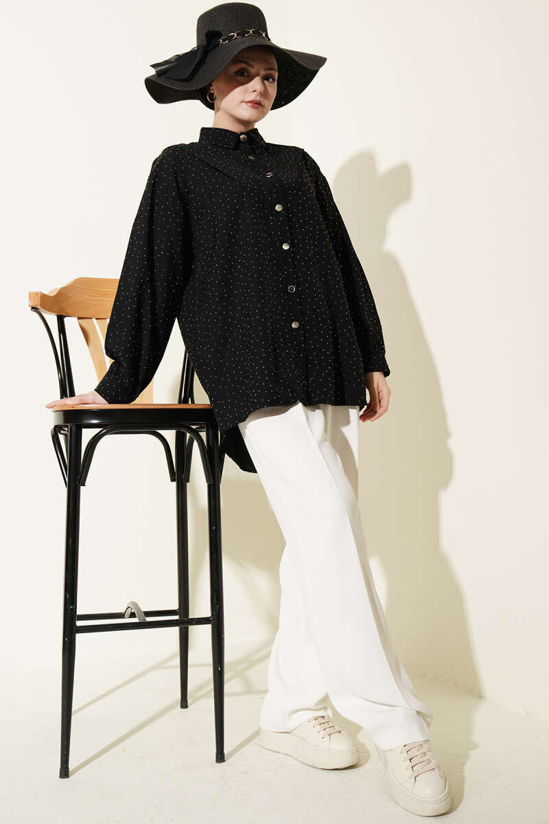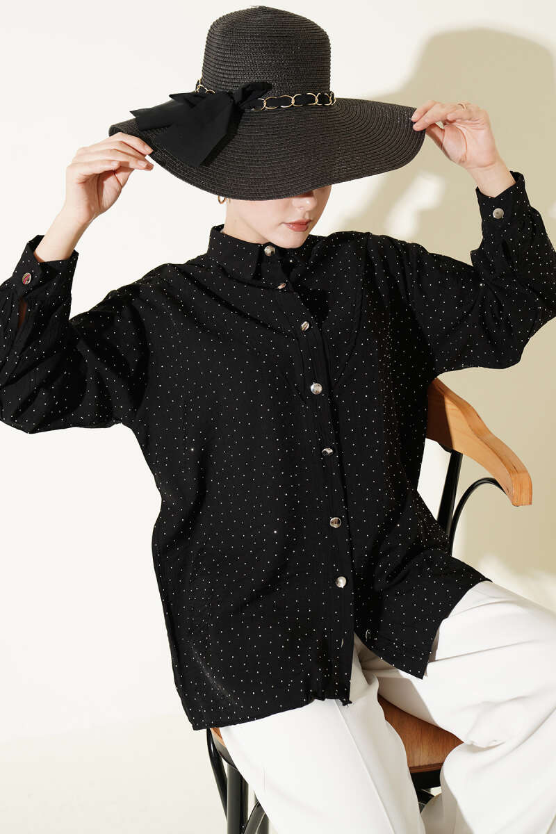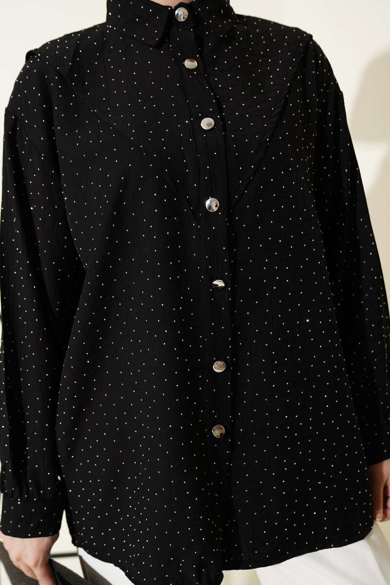 V Parçalı Taş Süslemeli Gömlek Siyah