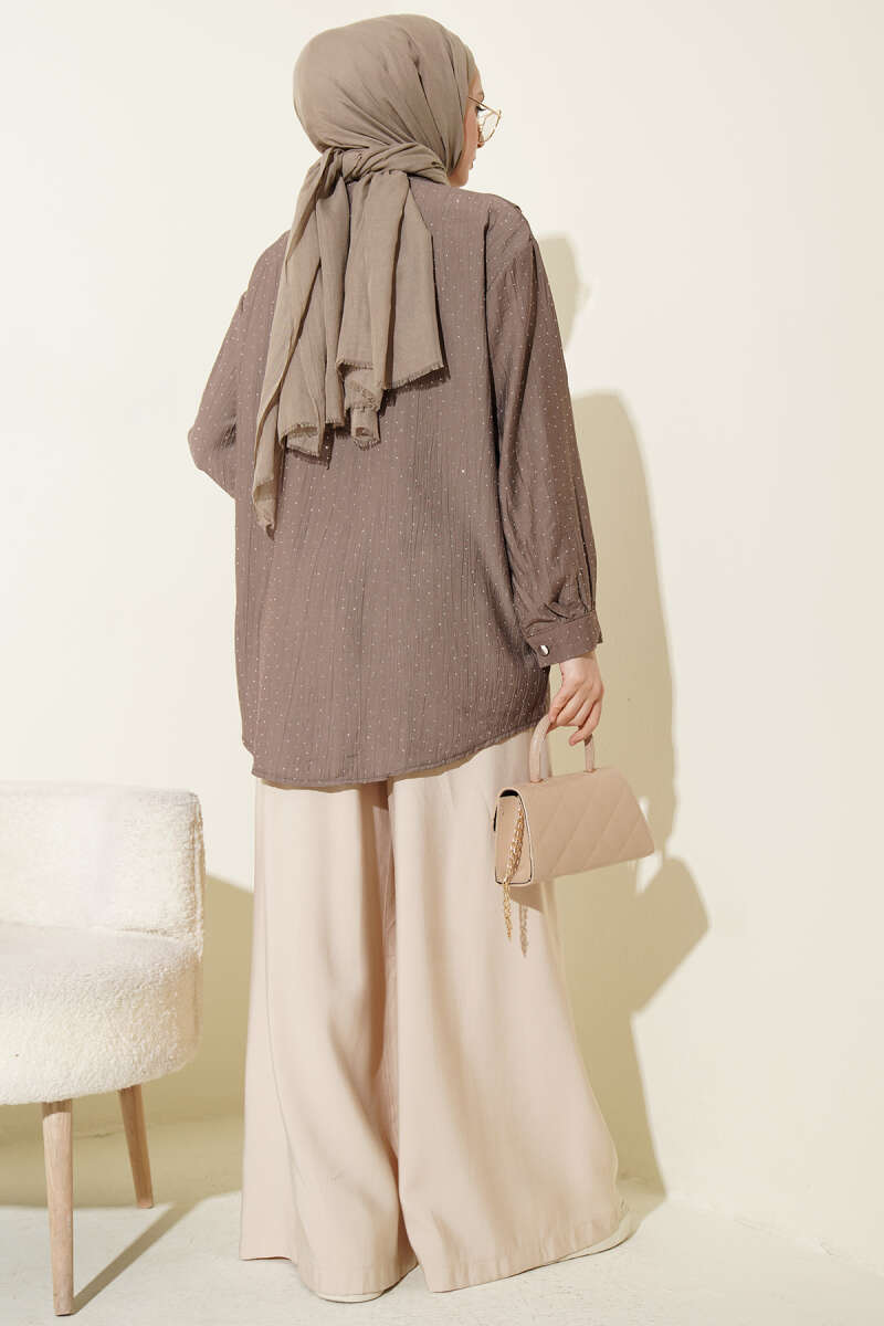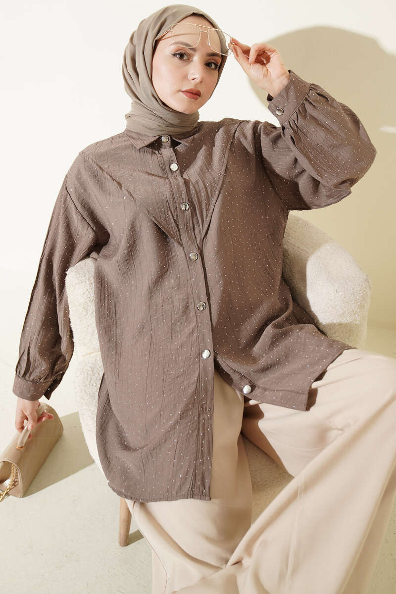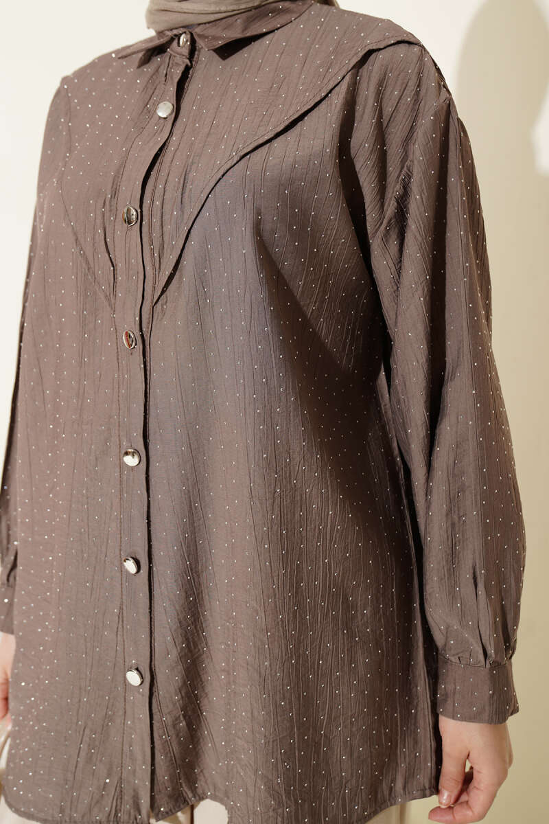 V Parçalı Taş Süslemeli Gömlek Vizon
