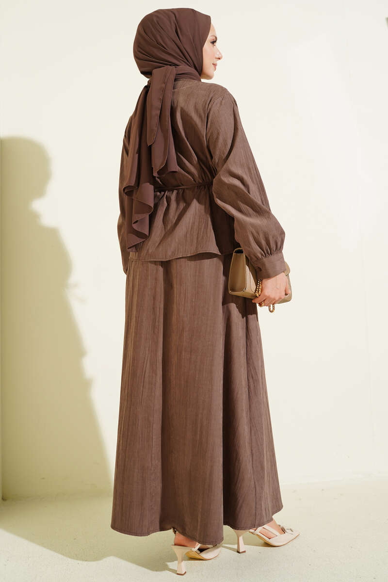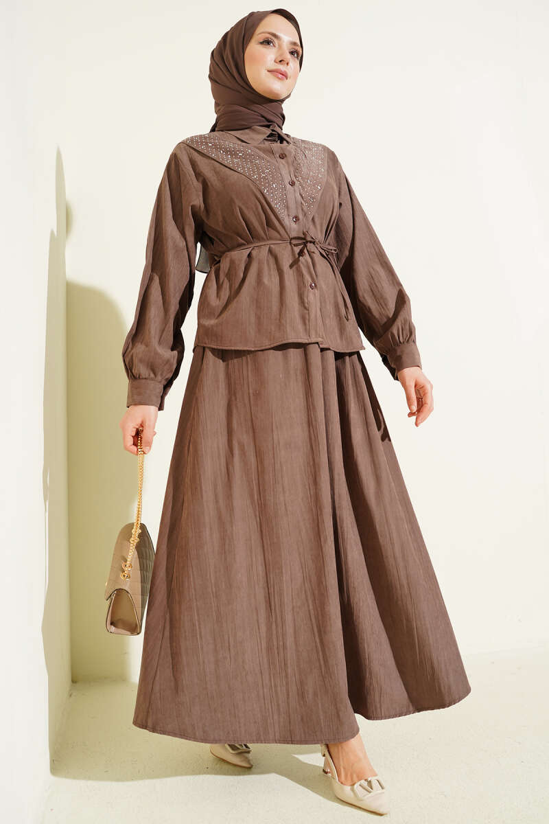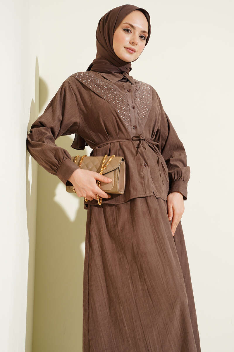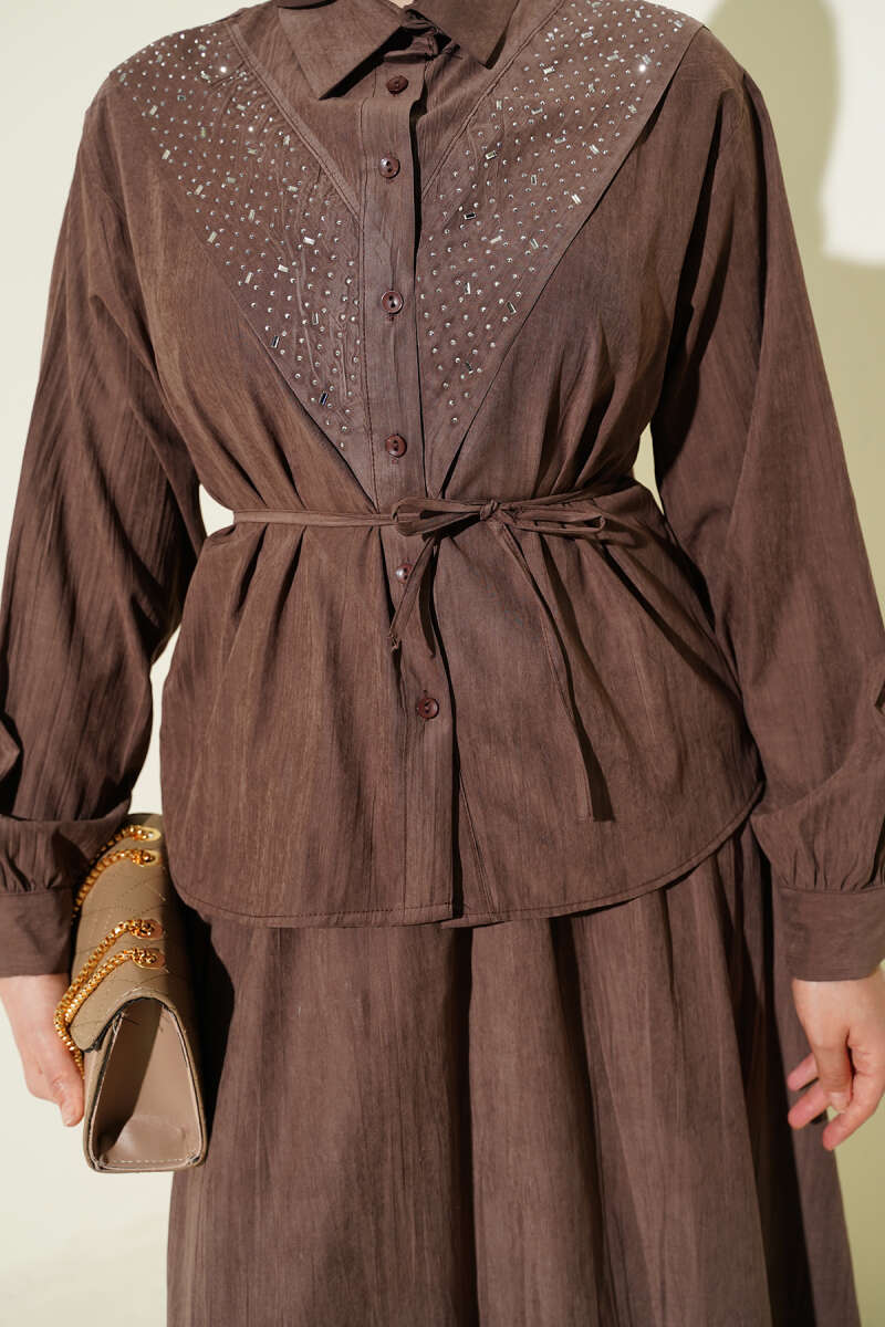 V Taş Süslemeli Tensel Etekli Takım Kahve