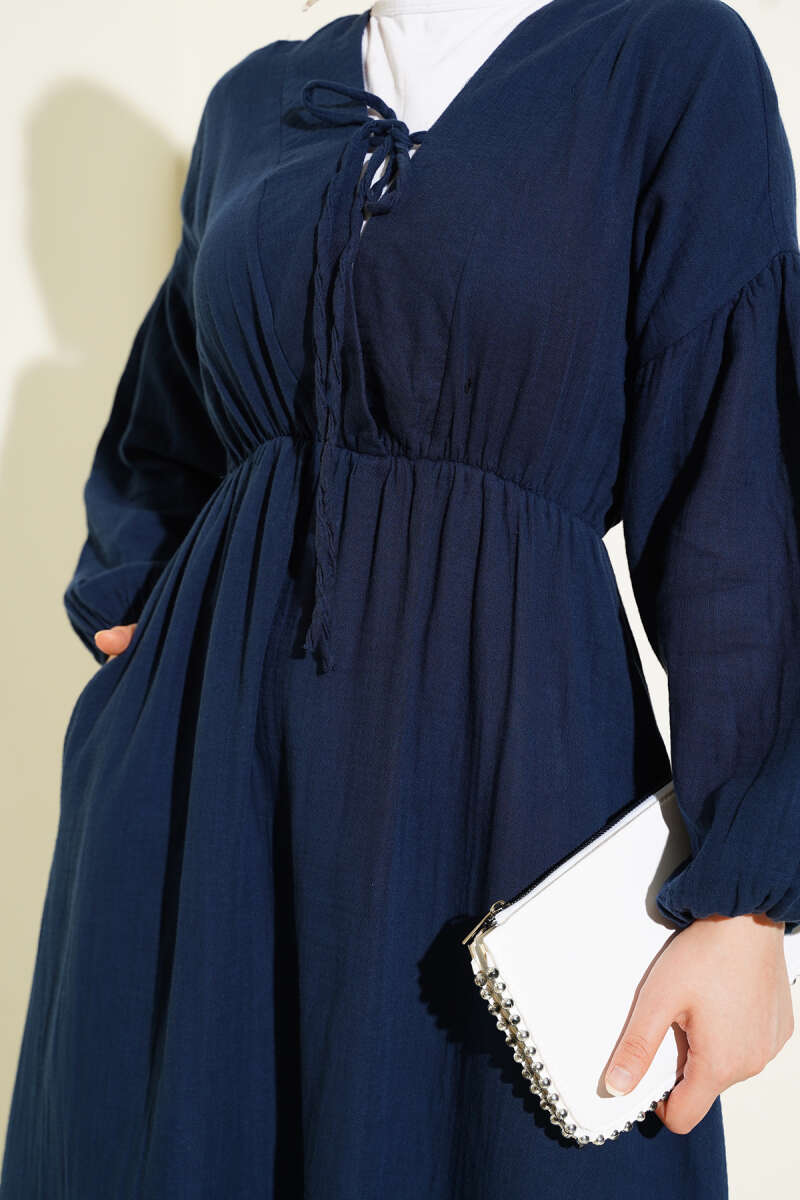 Şerit Ajur Desen Triko Elbise Bebe Mavi