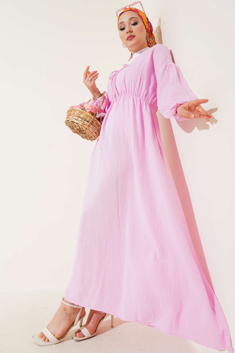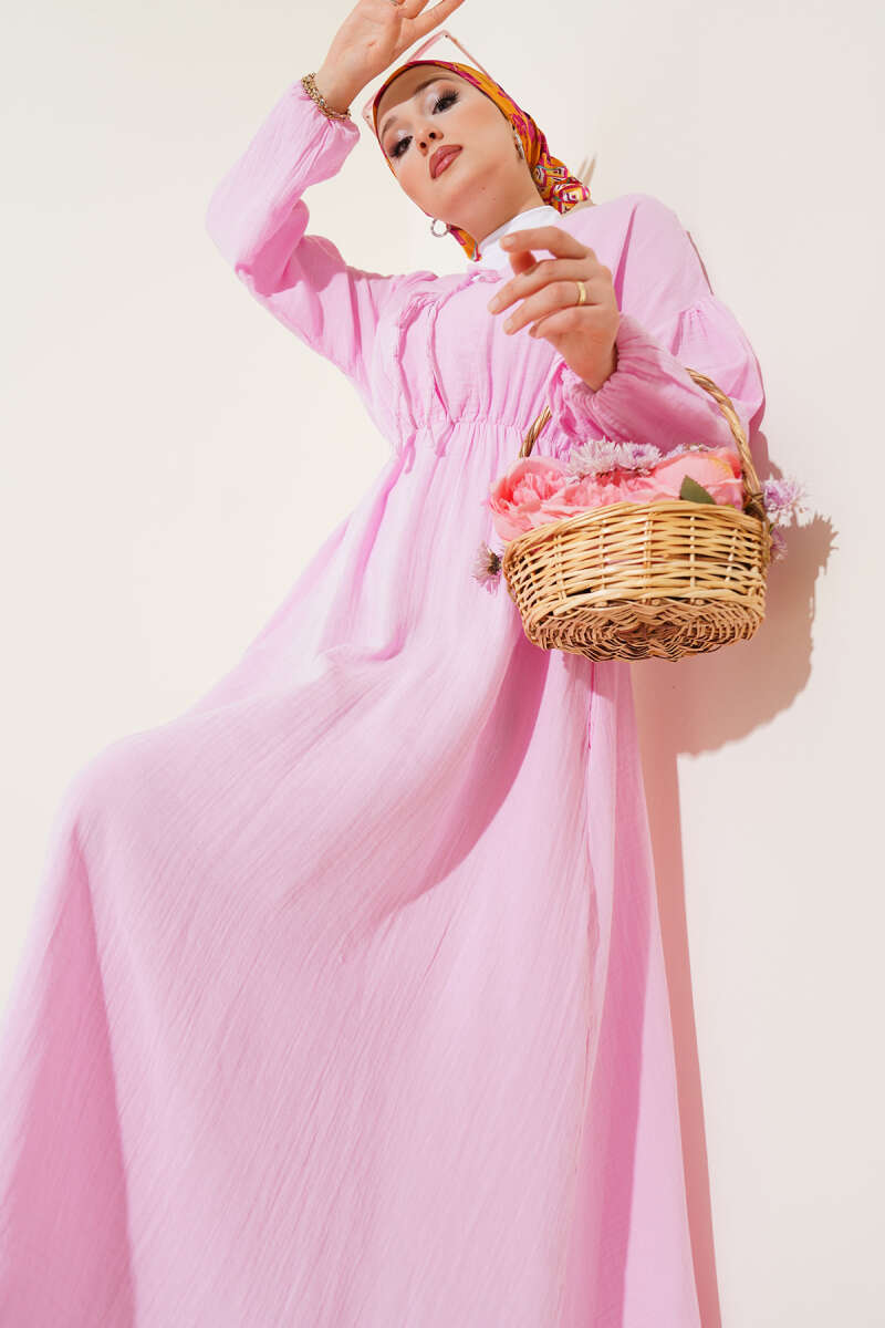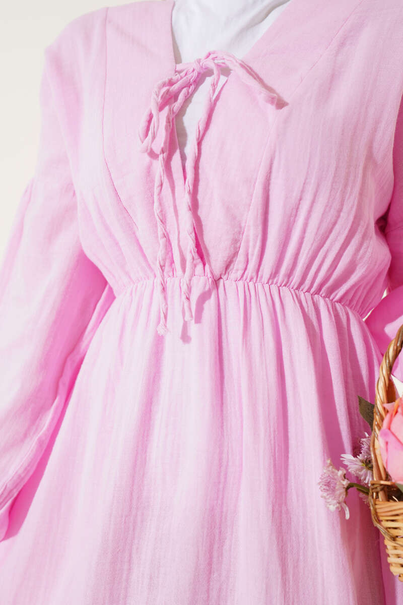 Şerit Ajur Desen Triko Elbise Gül Kurusu