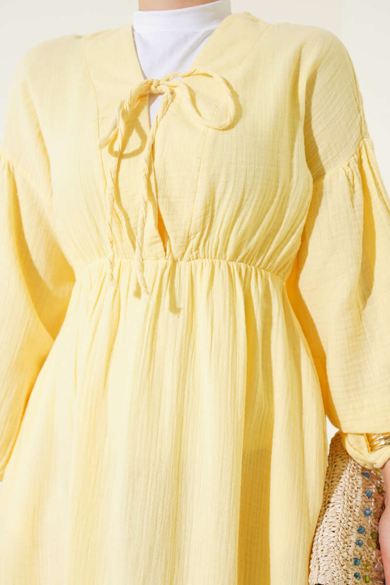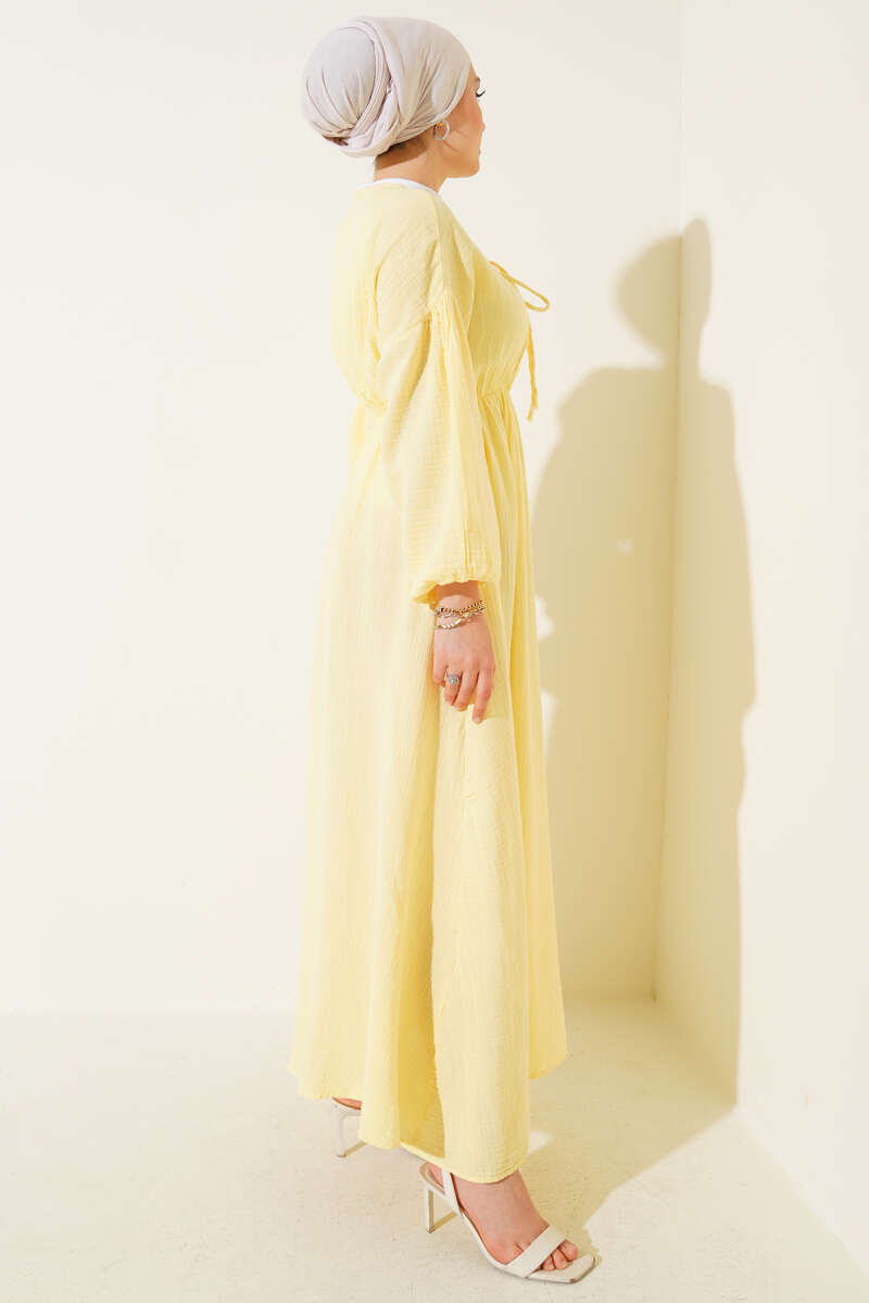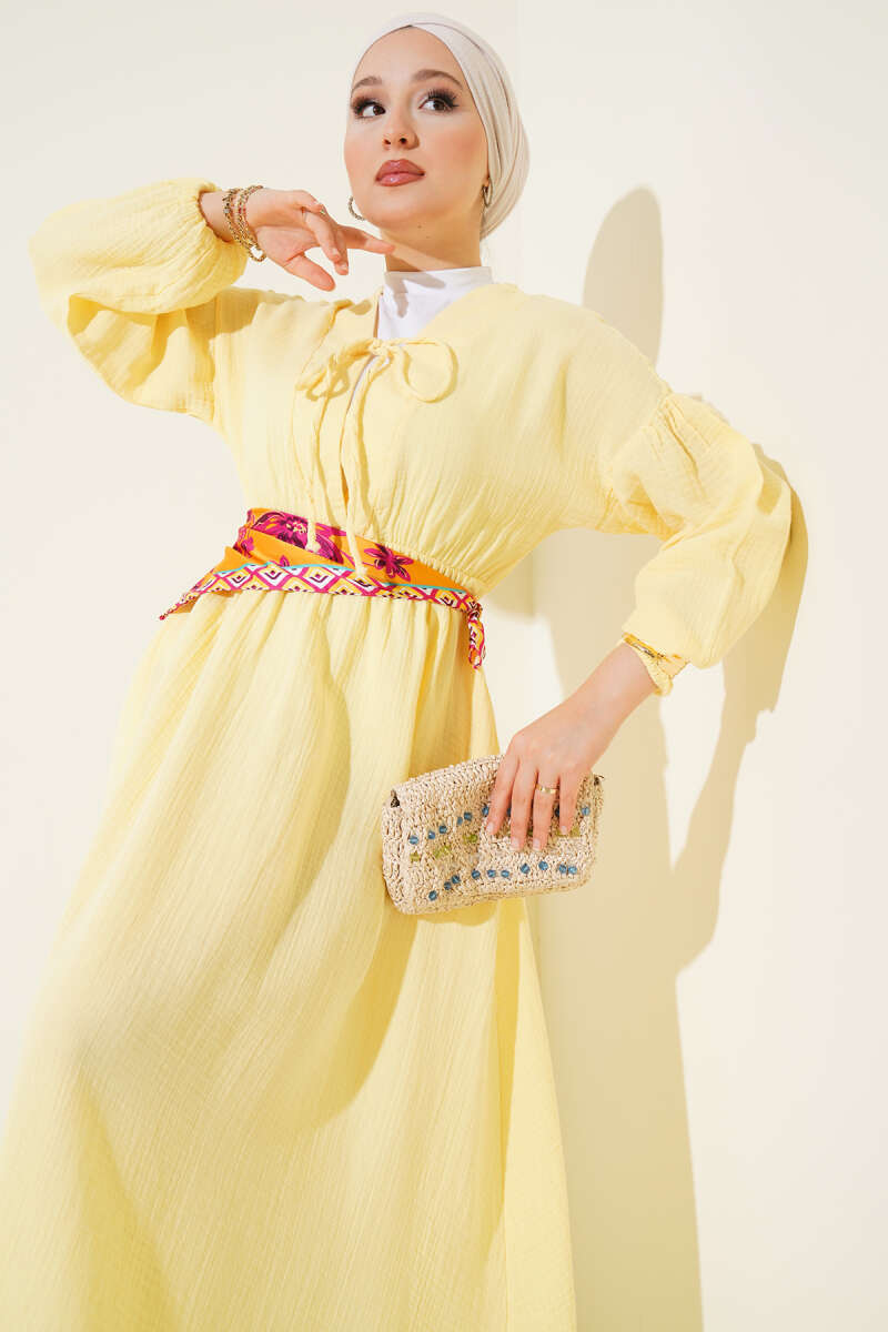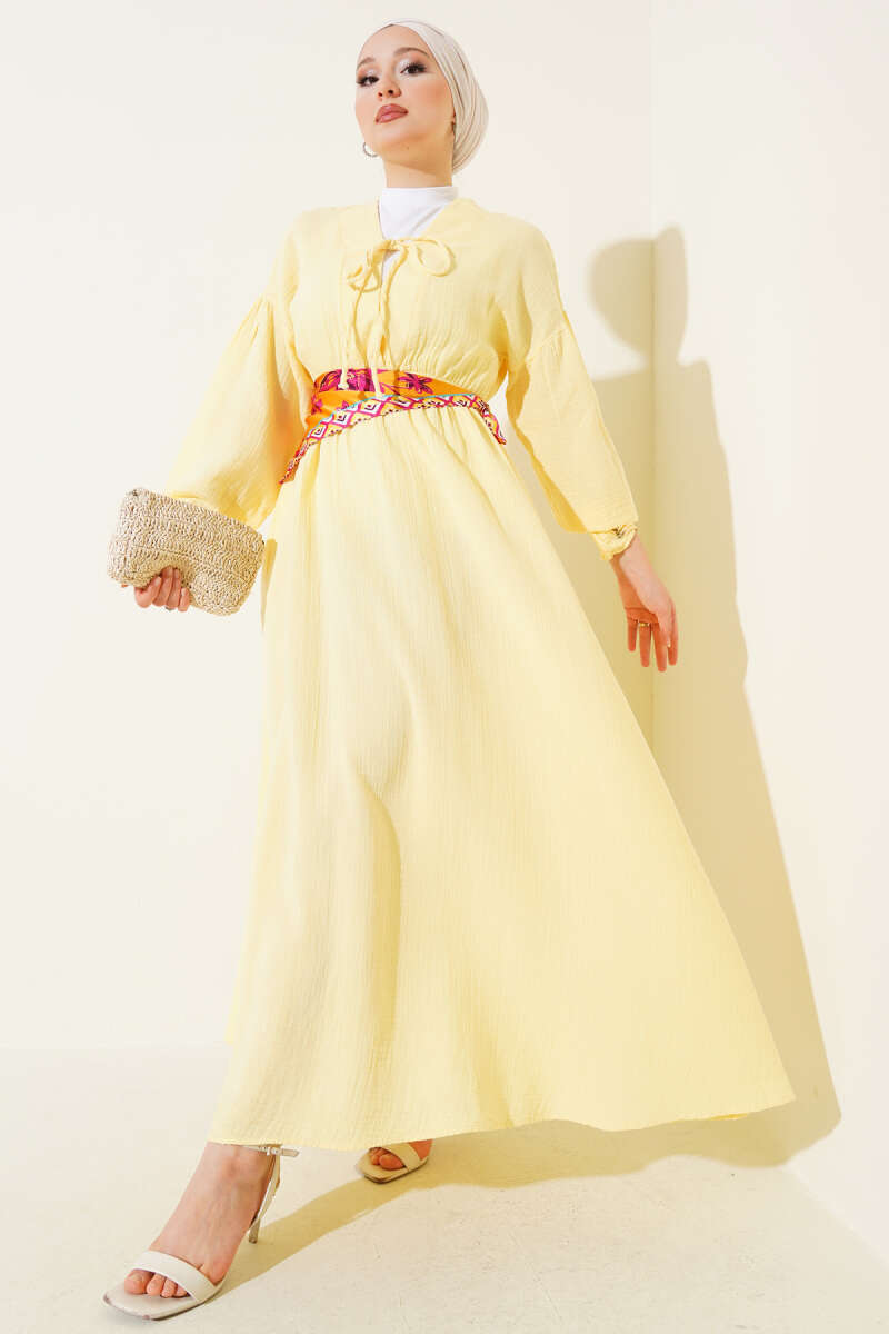 Şerit Ajur Desen Triko Elbise Sarı