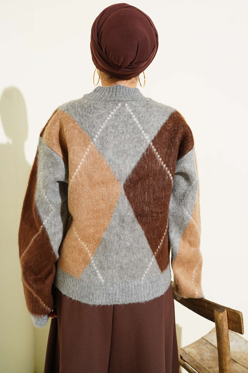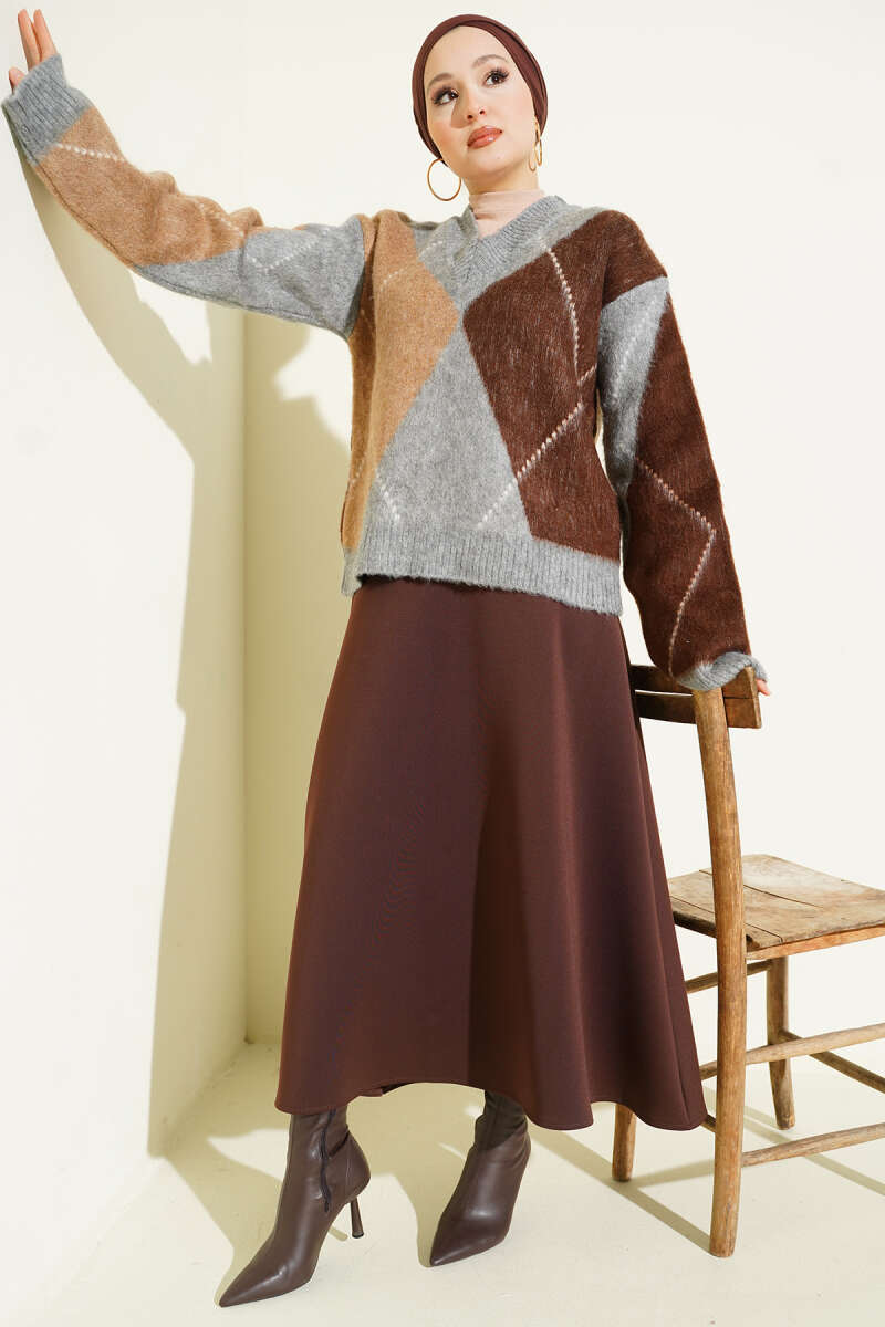 Çizgili Yan Yırtmaçlı Triko Kazak Kahve