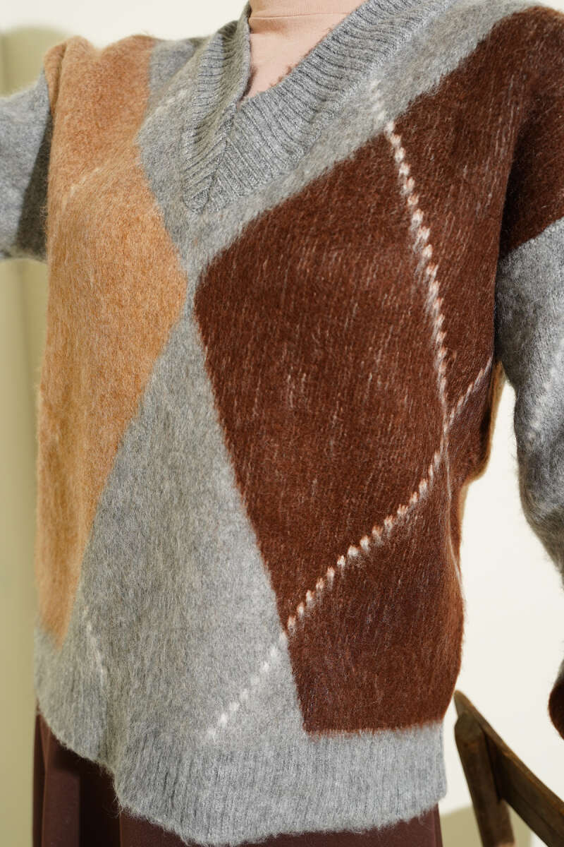 V Yaka Baklava Desenli Triko Kazak Bordo