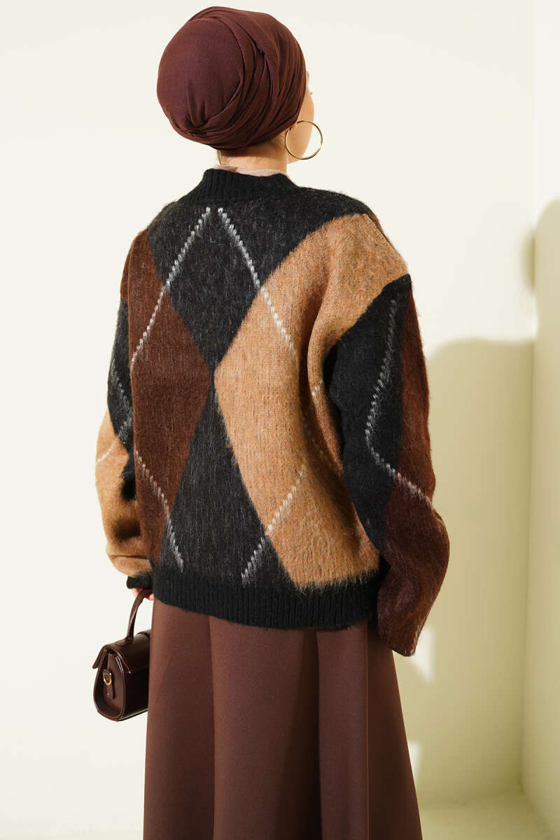 V Yaka Baklava Desenli Triko Kazak Siyah
