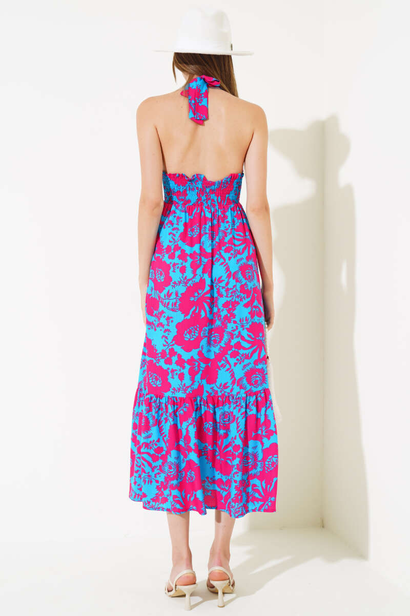 V Yaka Bel Büzgülü Elbise Mavi Fuşya