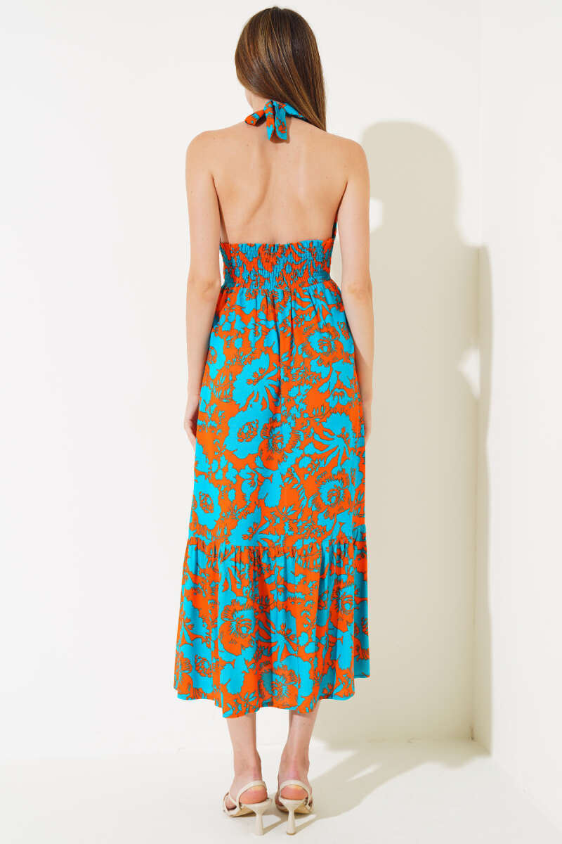 V Yaka Bel Büzgülü Elbise Mint Oranj
