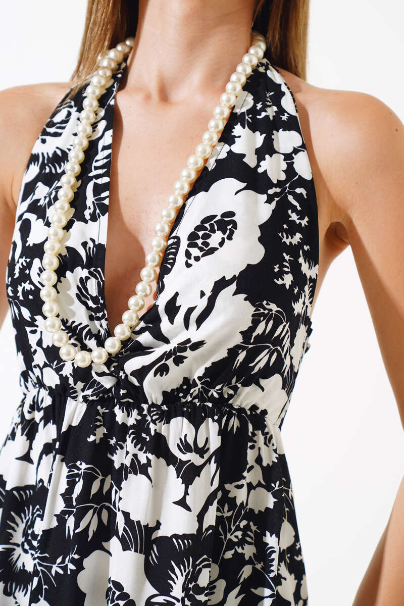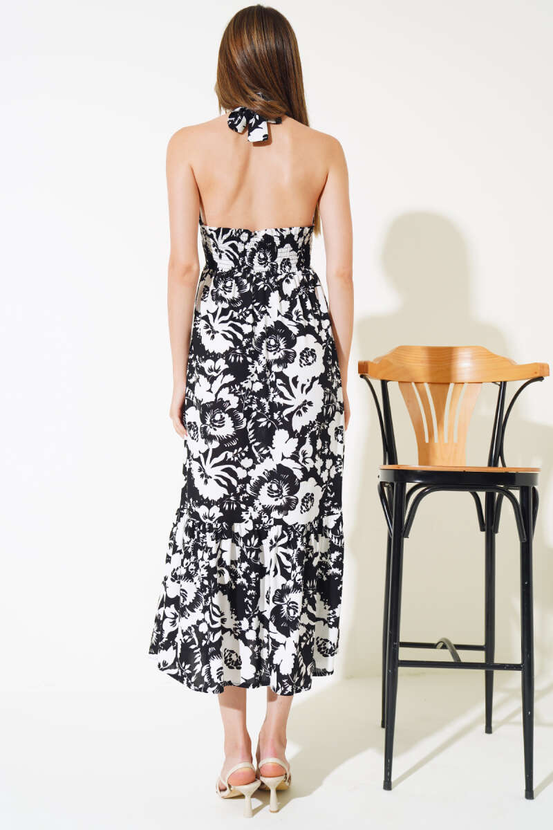 V Yaka Bel Büzgülü Elbise Siyah Beyaz