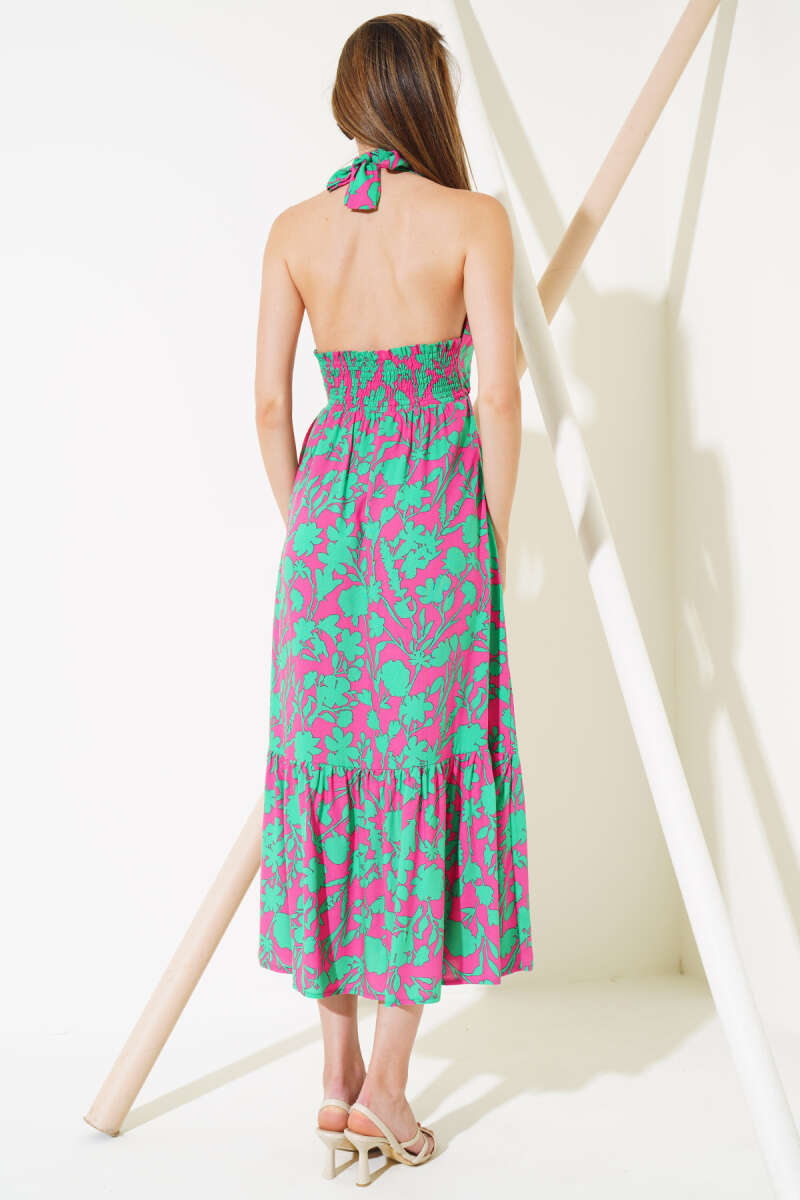 V Yaka Bel Büzgülü Elbise Yeşil Fuşya