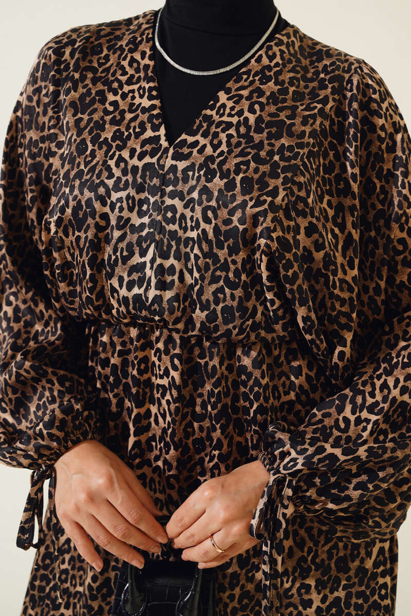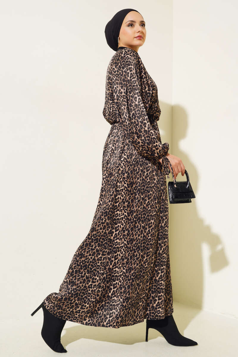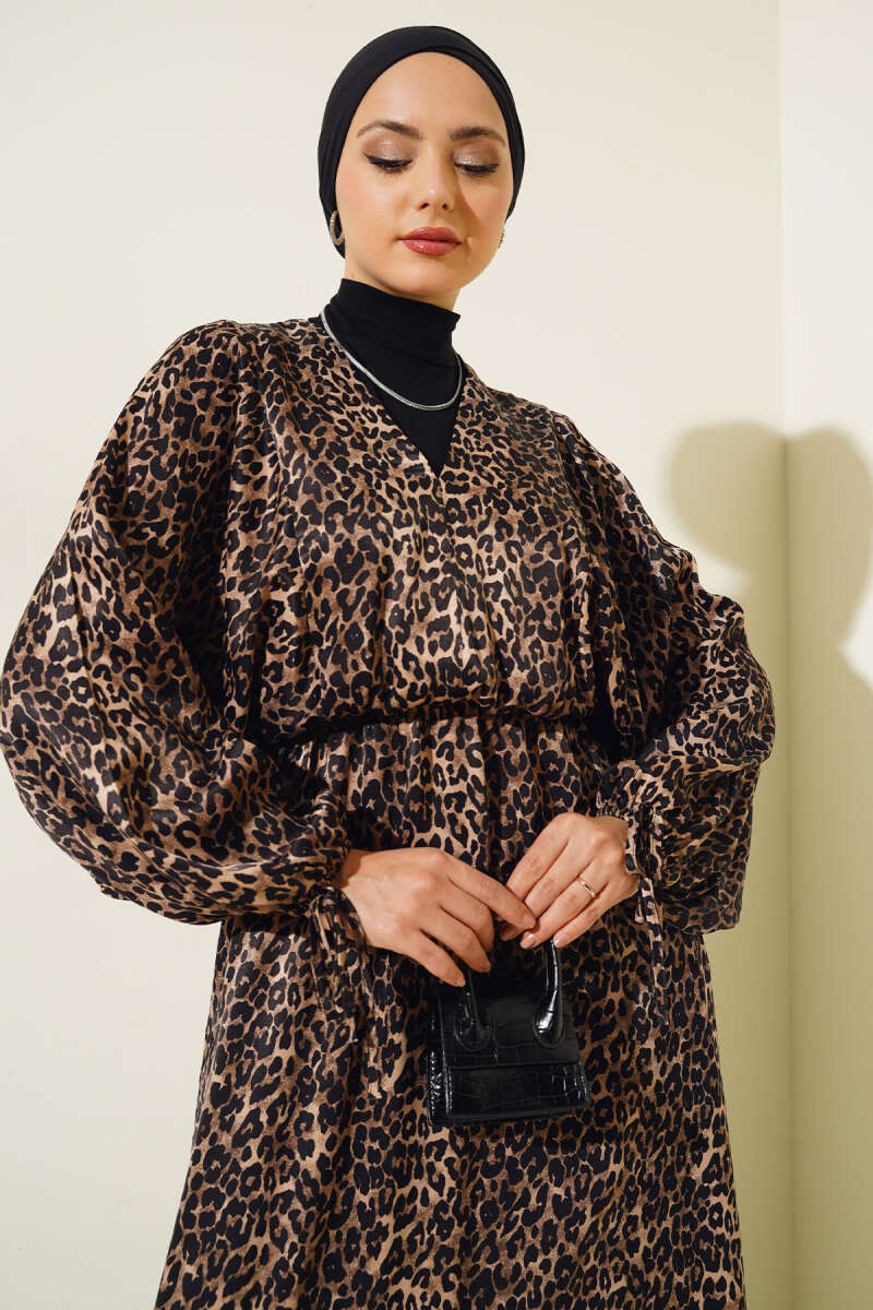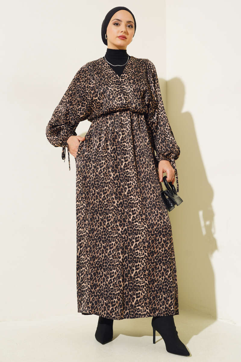 Kuşaklı Ekose Desenli Kloş Elbise Kahve
