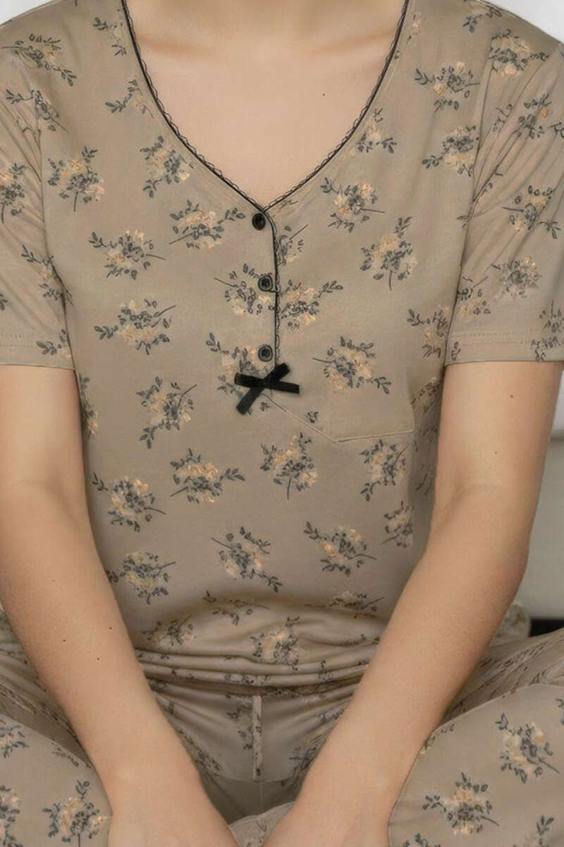 V Yaka Çiçekli Kısa Kol Pijama Takım Vizon