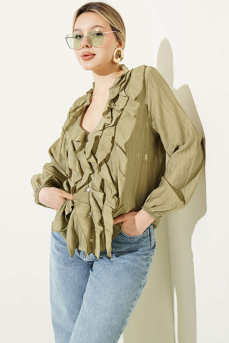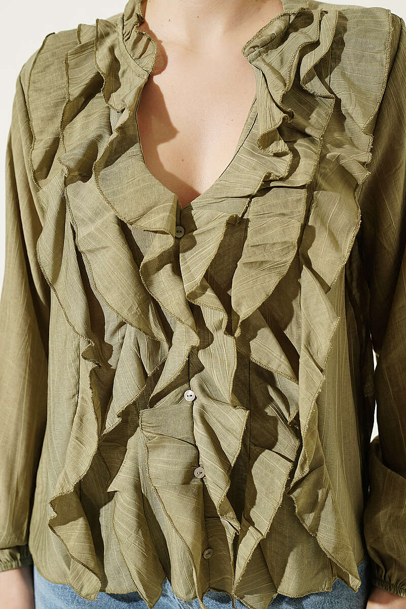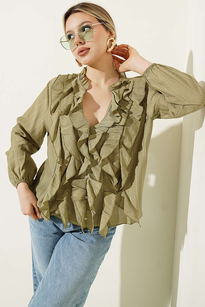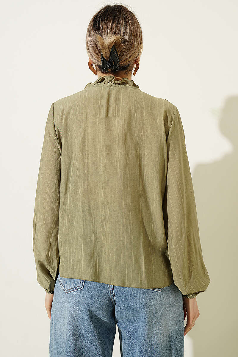 V Yaka Çizgili Fırfırlı Bluz Haki